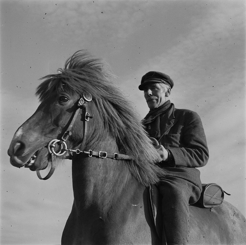 Borgarfjörður? Maður með kaskeiti heldur um beislistaum á hsti. Hnakktaska aftan við hann. Höskuldur Eyjólfsson á Hofsstöðum?