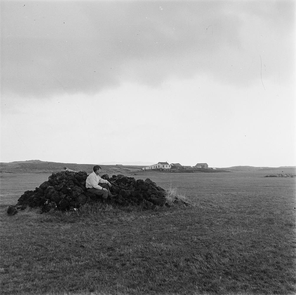 Hraungrýtishóll í túni. Maður situr við hann. Hús í fjarska, bæjarhúsin í Hólmi. Karl Norðdahl bóndi.
