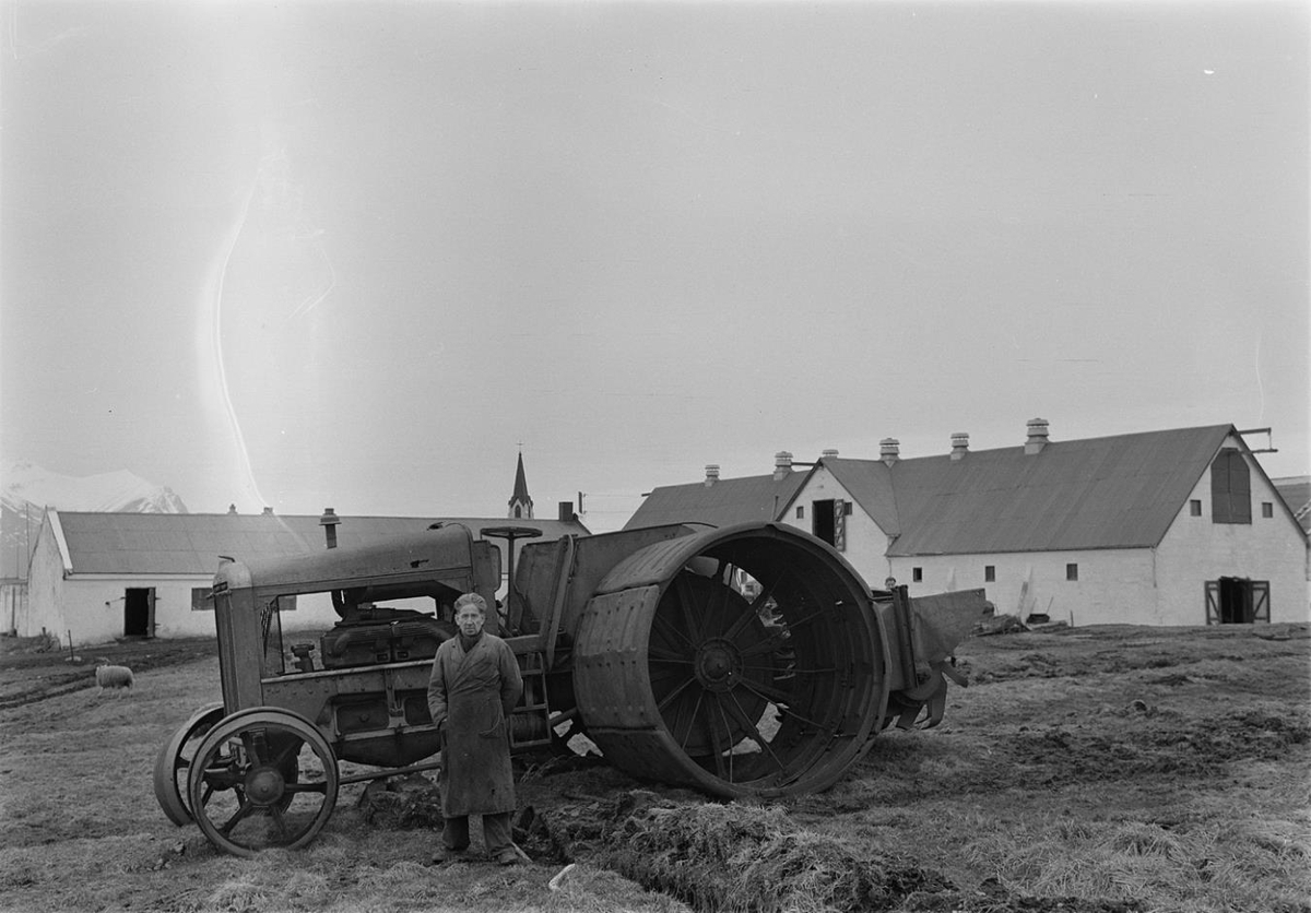 Maður stendur við þúfnabana. Útihús í bakgrunni og kirkjuturn sem stendur uppúr þökunum.
