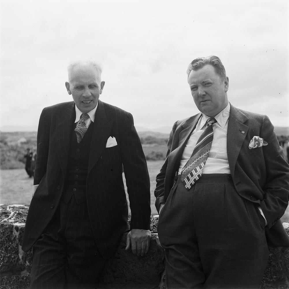 Tveir menn standa upp við vegg framan við hús. Guðmundur Jónsson og Þórður Pálmason. Aðalfundur Sambands íslenskra samvinnufélaga.