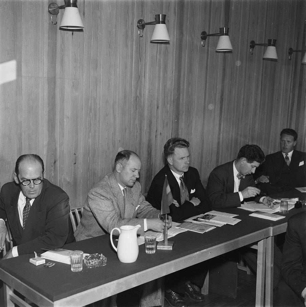Röð manna við borð á fundi. Ýmis fundargögn á borðum . Satrfsmenn SíS. Helgi Þorsteinsson lengst til vinstri og Hjörtur Hjartar þriðji frá vinstri. Aðalfundur Sambands íslenskra samvinnufélaga.