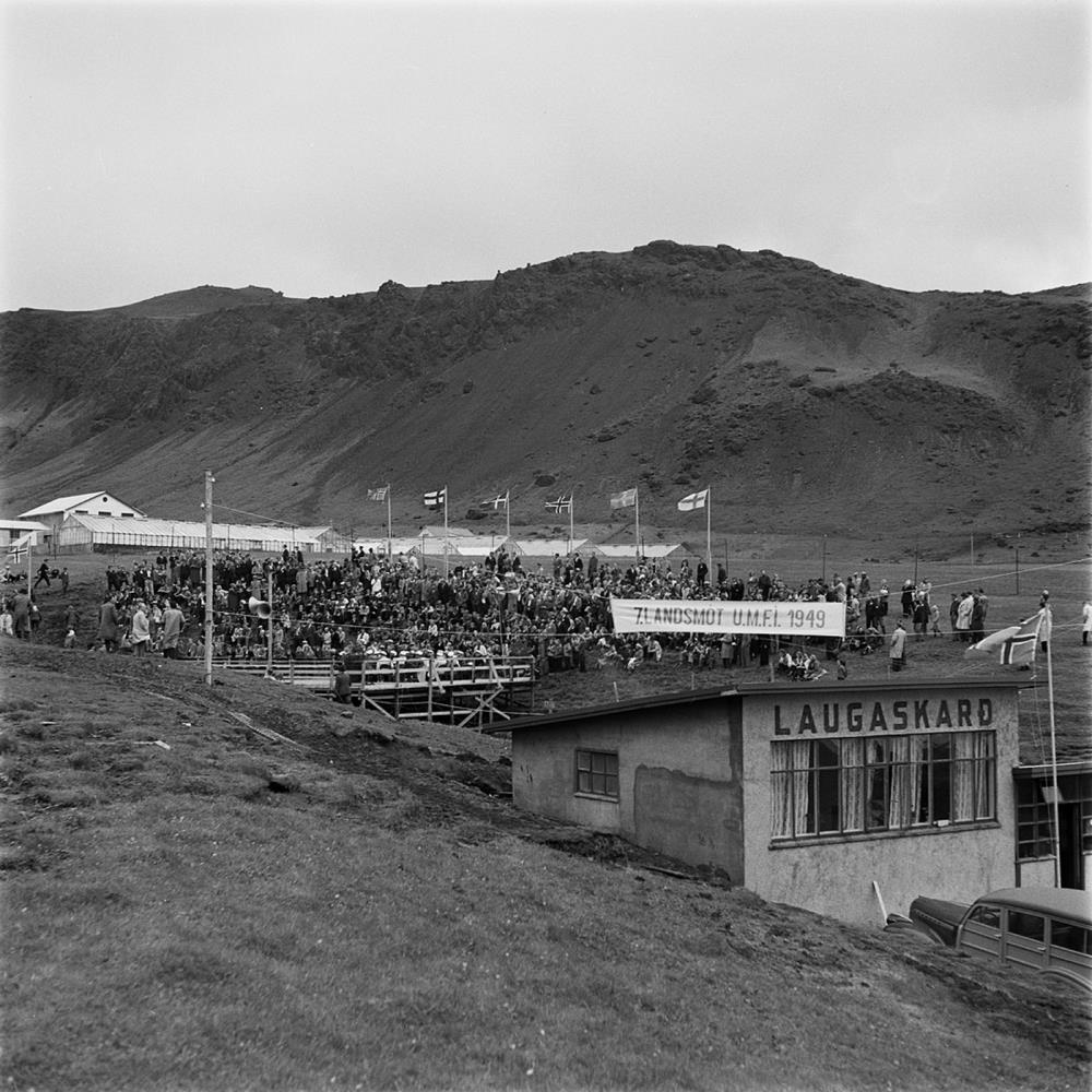 Sér yfir hús við sundlaug. Ofan við það er íþróttapallur og mannfjöldi við hann að fylgjast með. Landsmót Ungmennfélags Íslands.