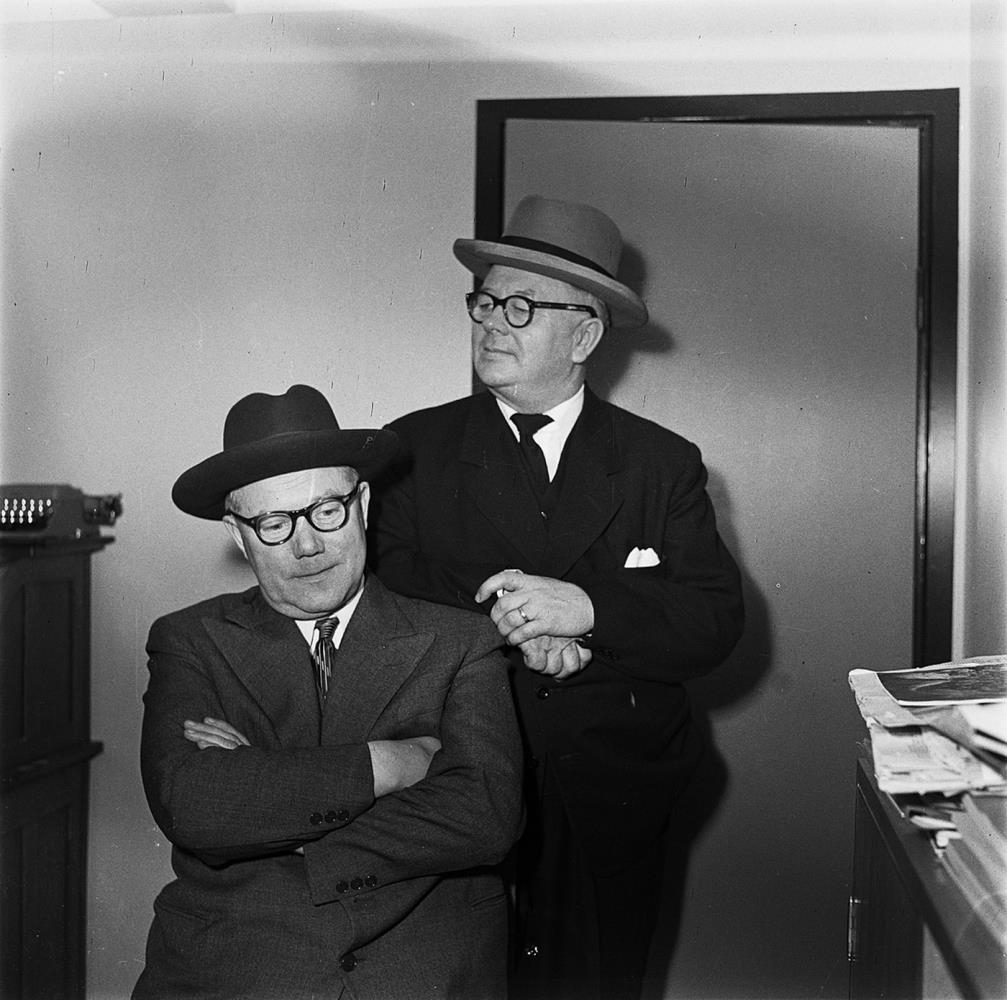 Tveir karlar í jakkafötum með hatta uppstilltir á skrifstofu. Mennirnir eru t.f.v.: Halldór Ásgrímsson og Karl Kristjánsson.