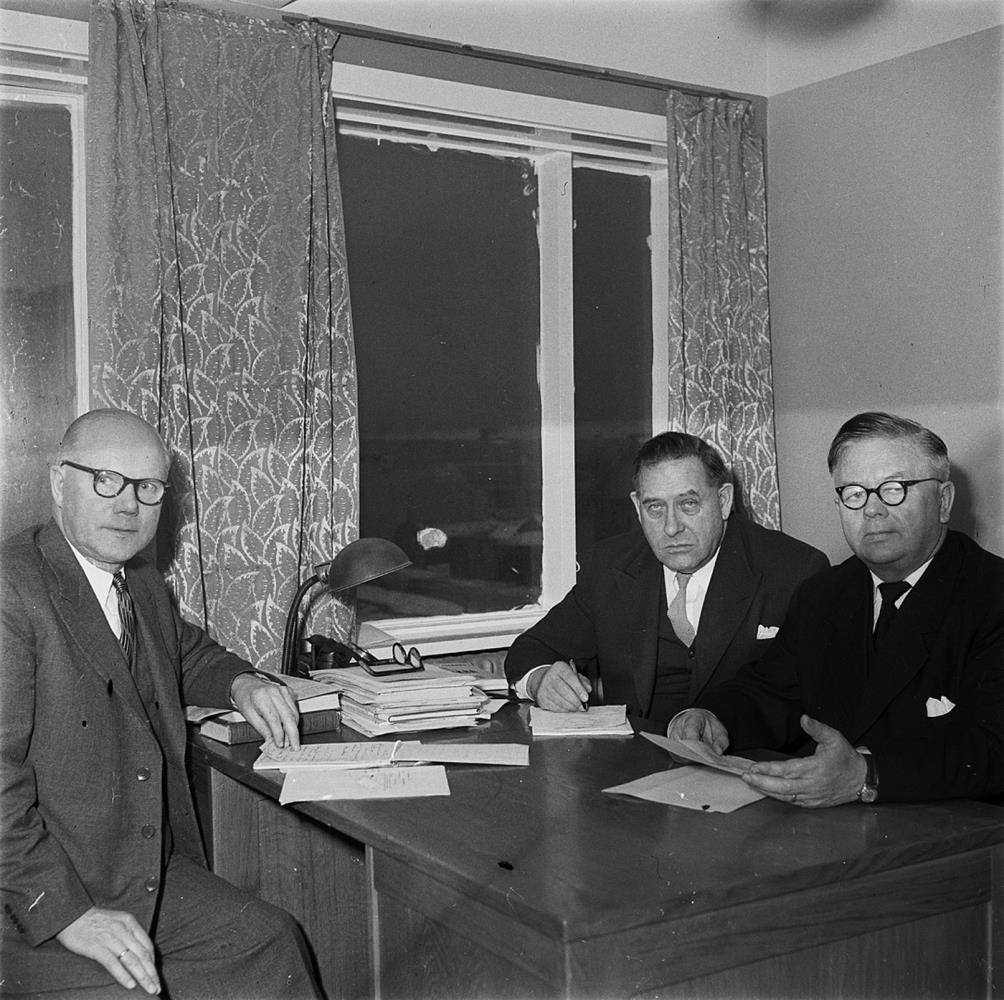Þrír karlmenn sitja við skrifborð, lampi og pappírsgögn á borðinu. Gluggatjöld fyrir glugga. Mennirnir eru t. f.v.: Halldór Ásgrímsson, Helgi Jónasson og Karl Kristjánsson.