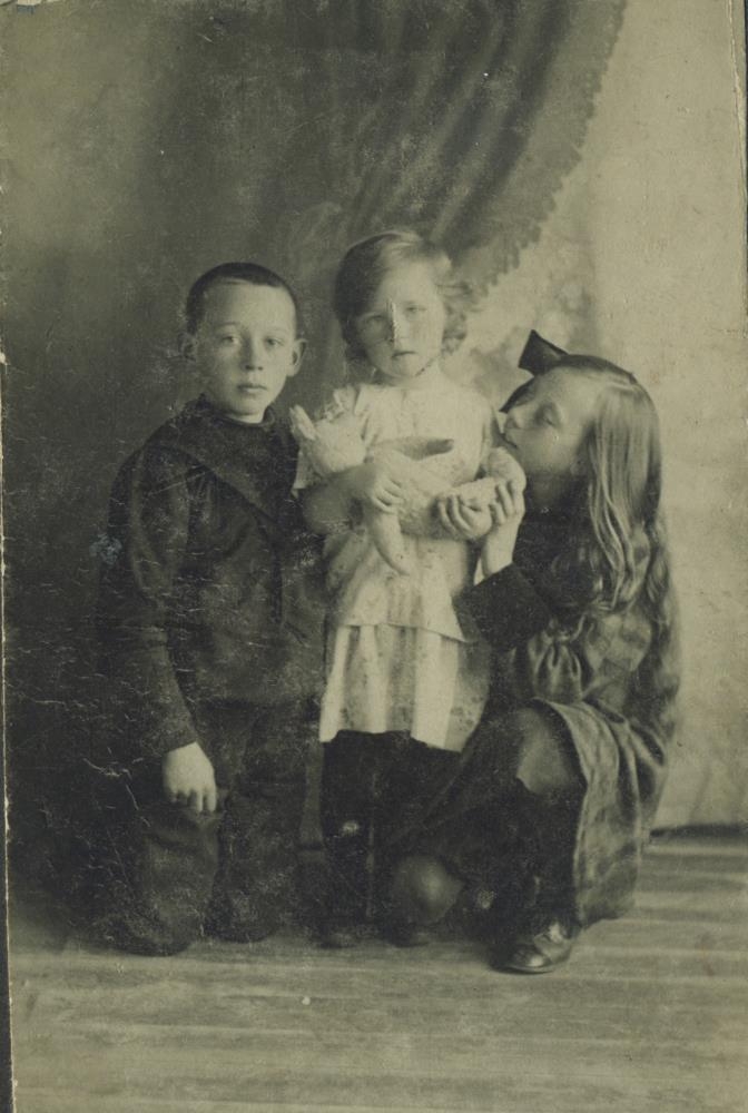 Börnin á myndinni eru ónafngreind, Gísli er greinilega eitt þeirra en hann átti 5 systur og því ómögulegt að segja hver þeirra er með honum á myndinni.