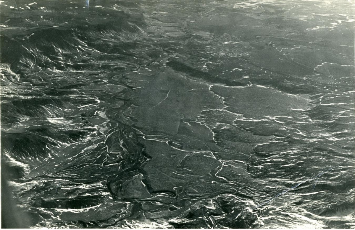 Loftmynd. Hálendið, snjór, fjöll, jöklar, ár og lækir.