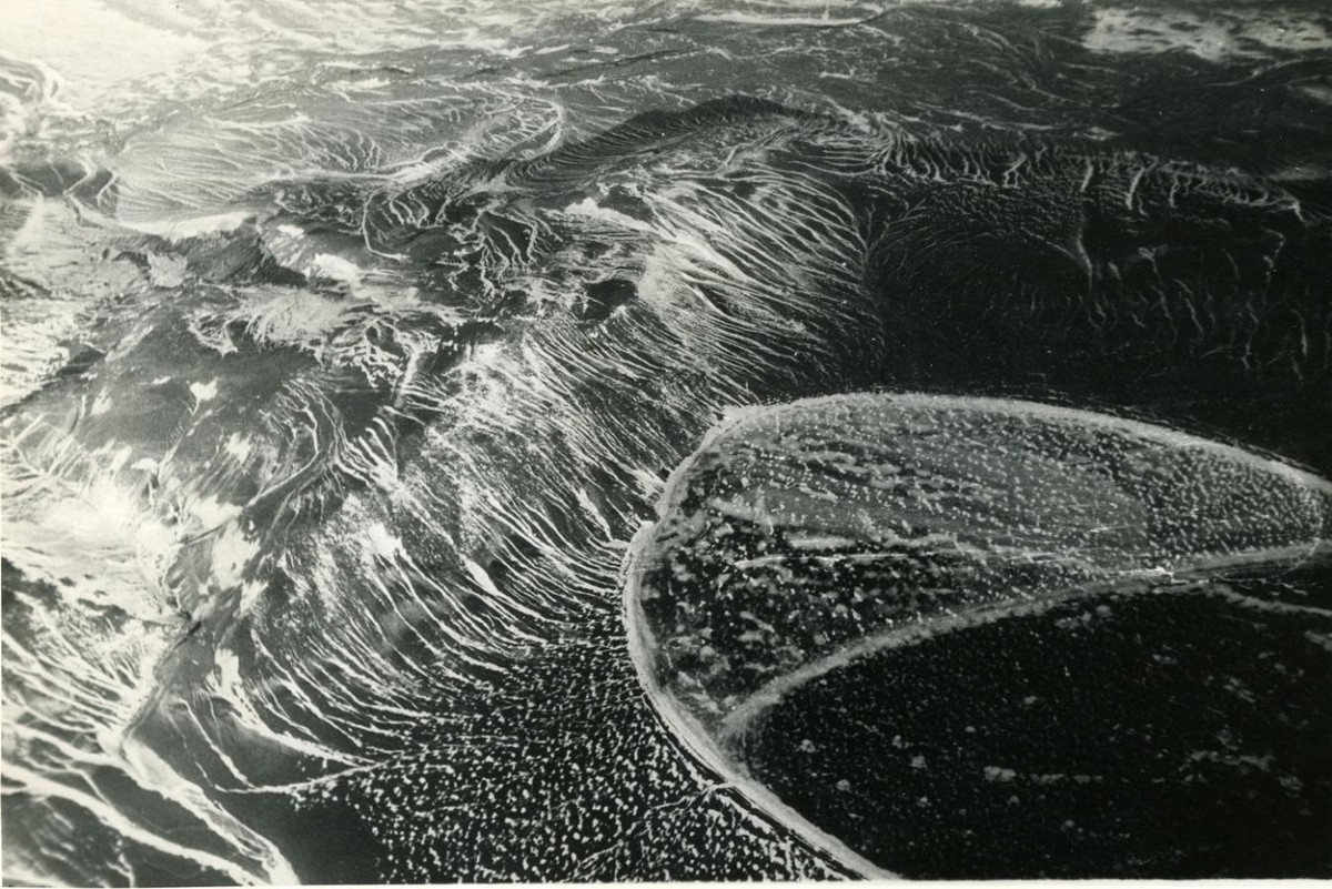 Loftmynd. Hálendið, snjór, fjöll, jöklar, ár og lækir.
