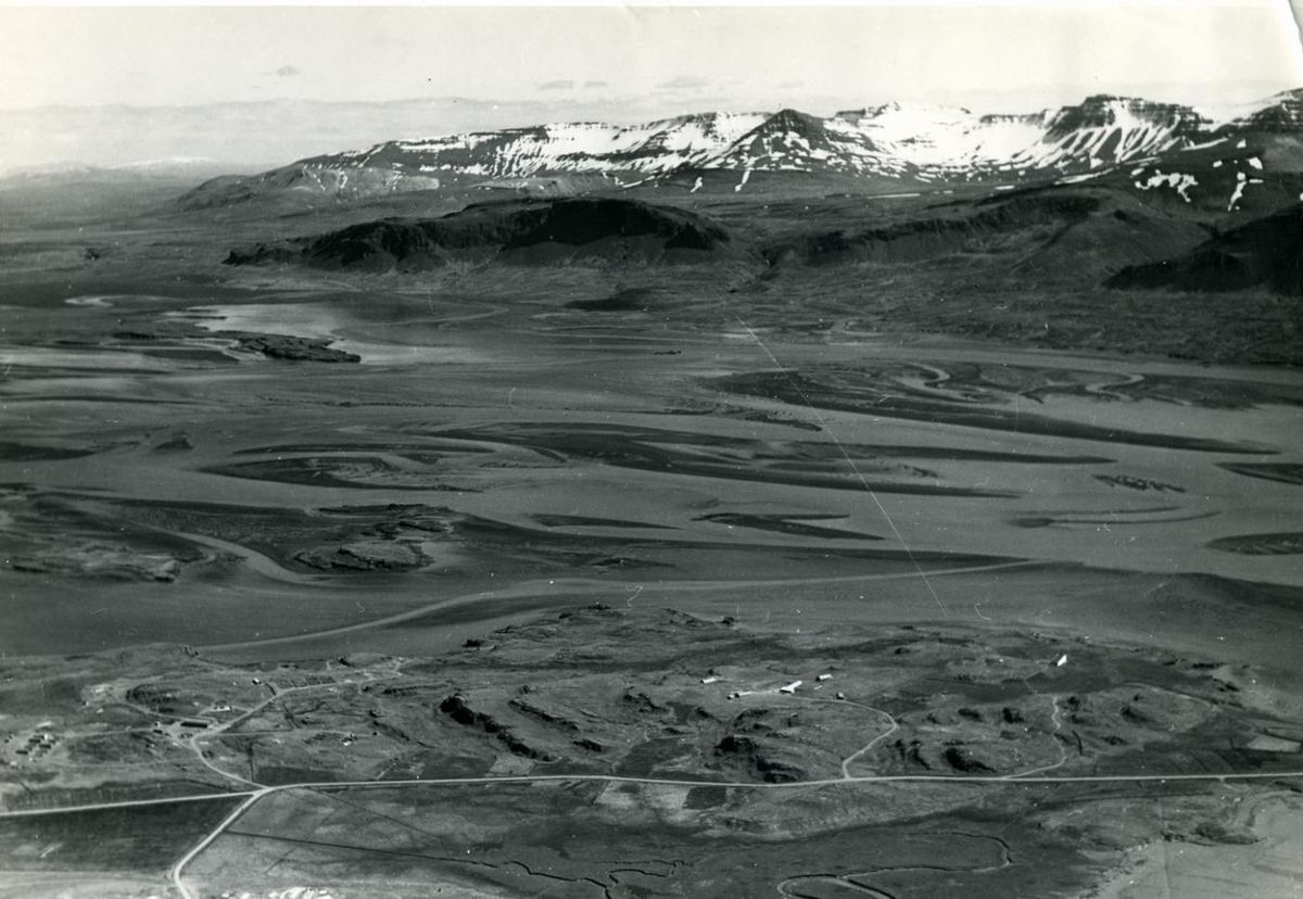 Loftmynd. Hálendið, snjór, fjöll, jöklar, ár og lækir. Í forgrunni vegur og nokkrir sveitabæir.