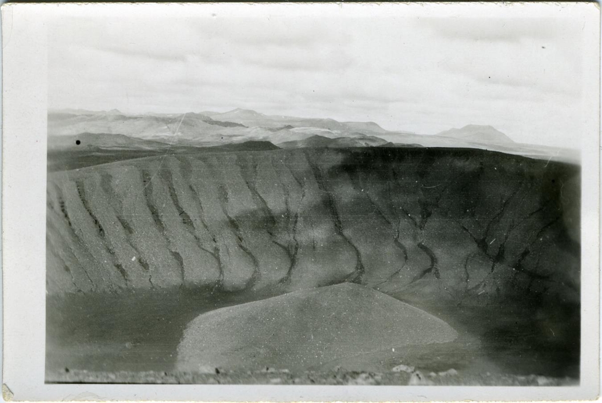 Á bakhlið er skrifað: „Hverfjall við Mývatn (Útsjón niður í gíginn). Einn elsti gígur á Ísland,“