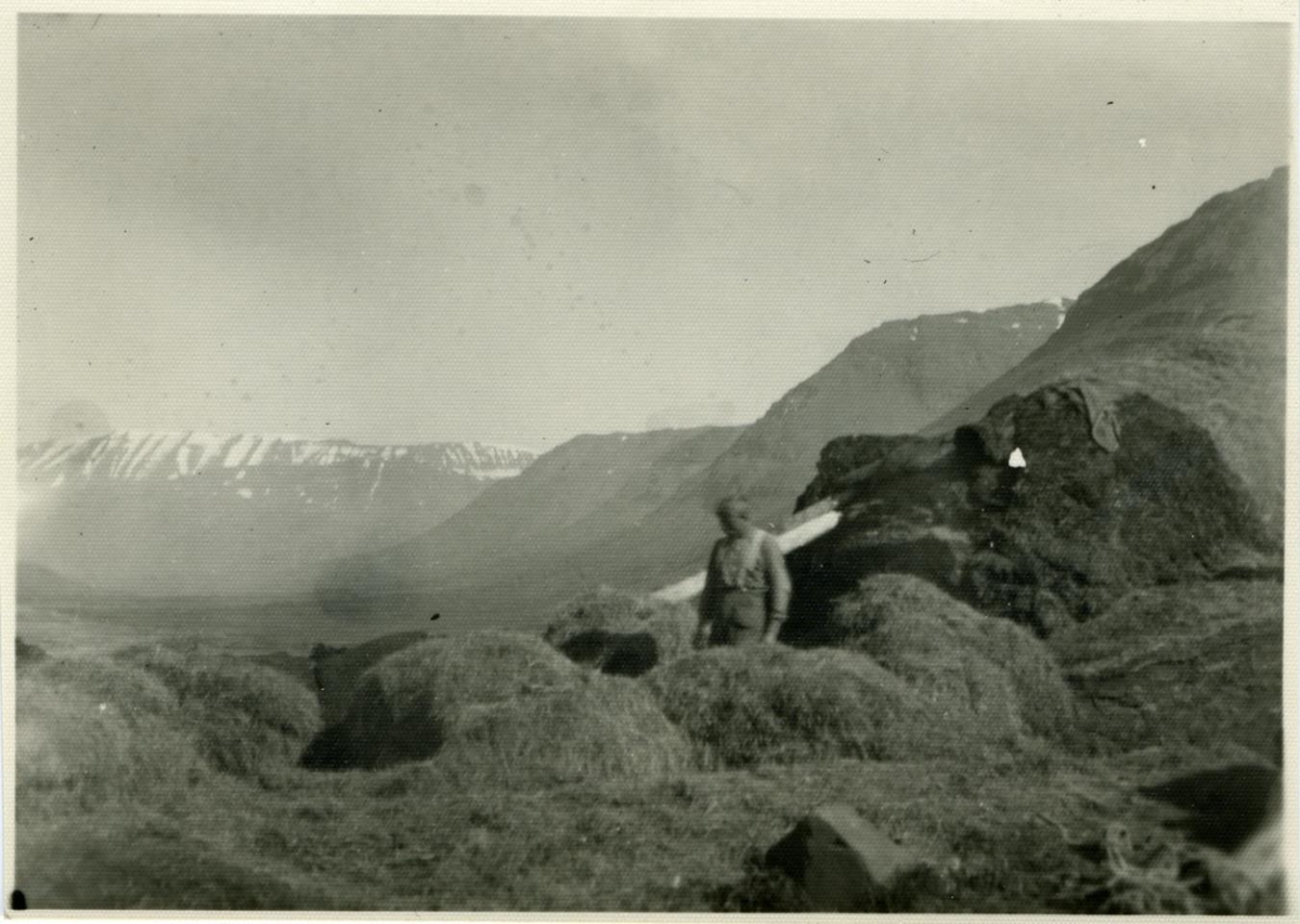 Karlmaður stendur milli heybagga sem leystir hafa verið niður af hestum í heylest. Líklega á að setja heyið upp í galta.