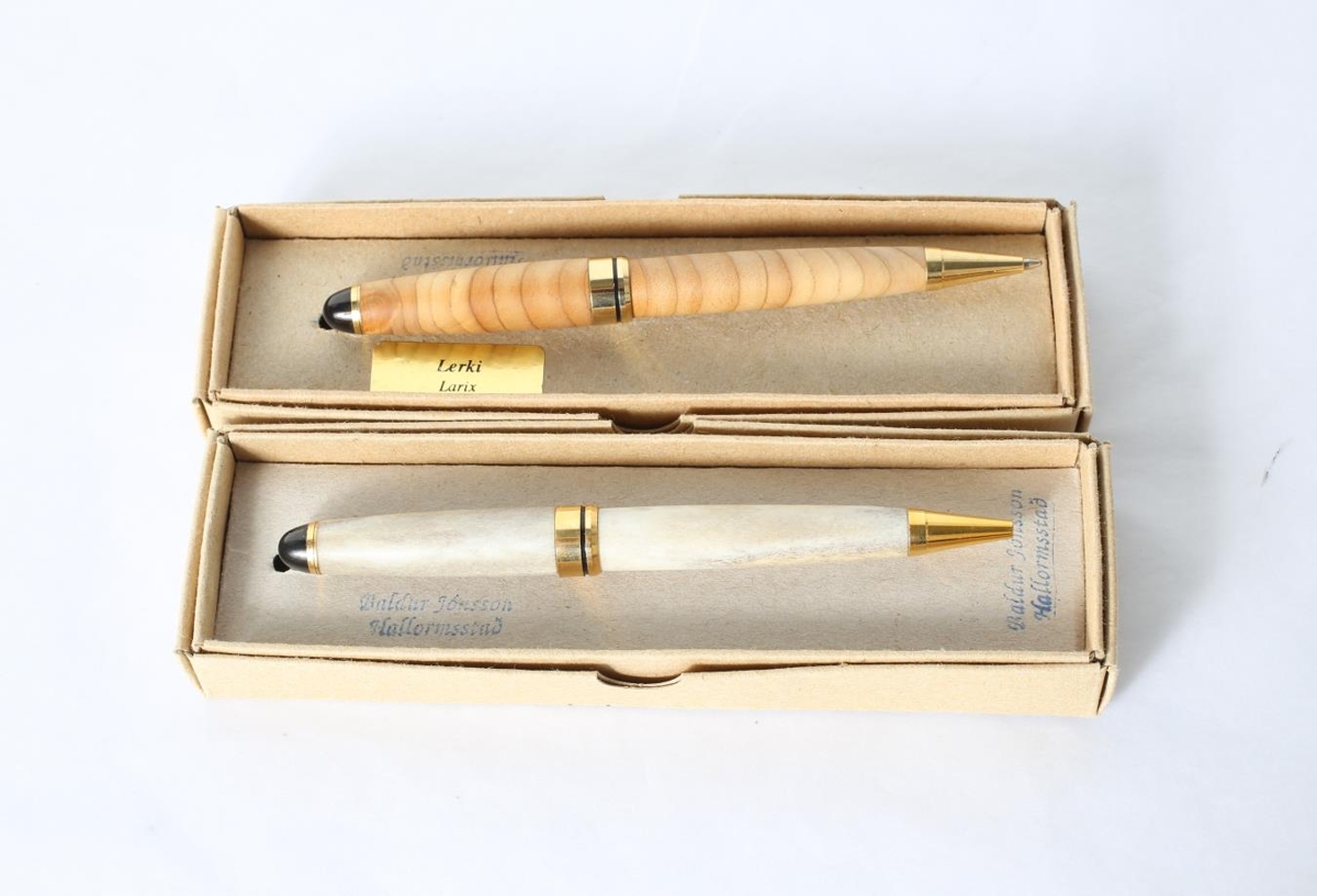 Tveir renndir pennar, annar úr íslensku lerki en hinn úr hreindýrshorni. Báðir eru unnir af Baldri Jónssyni á Hallormsstað, bróður Stefáns, eiganda pennanna. Báðir pennarnir eru í kössum sem eru brúnir að lit.