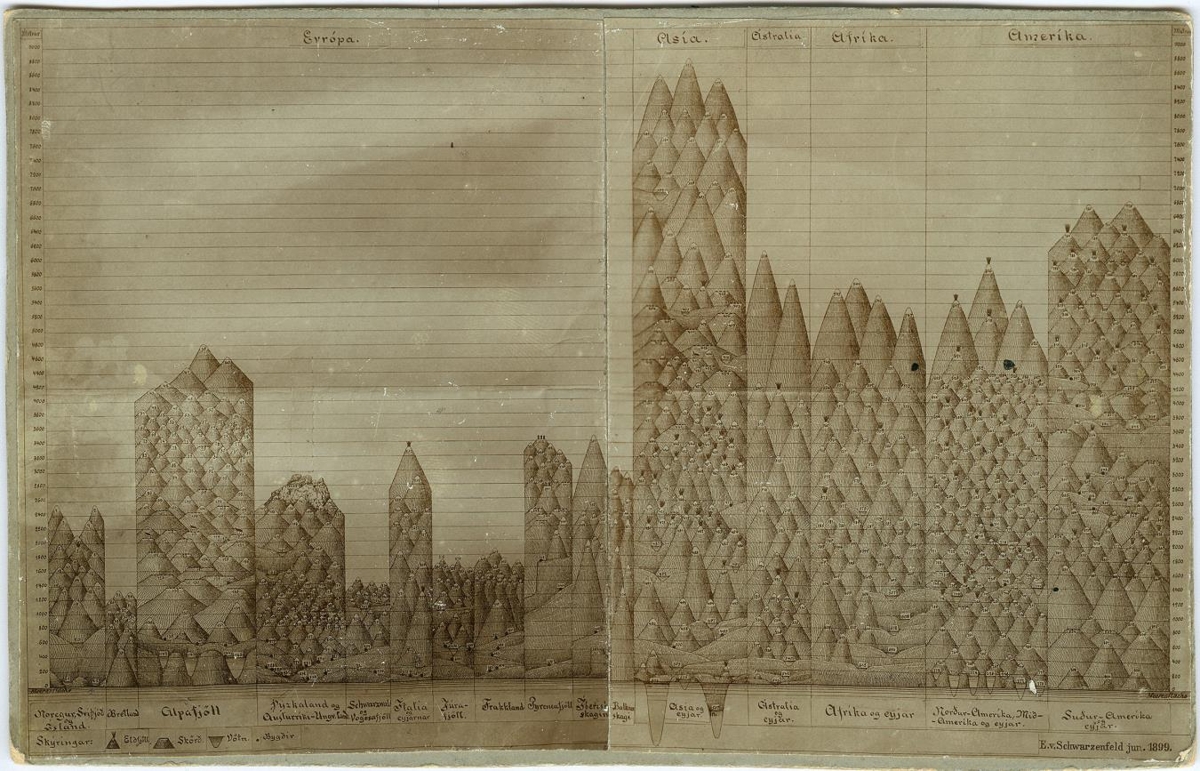 Teikning með yfirliti yfir fjöll eftir álfum og evrópulöndum. Fjöldi fjalla og hæð þeirra sett upp í eins konar línurit. Í neðra hægra horni stendur E. v. Schwarzenfeld jun. 1899.