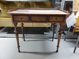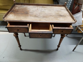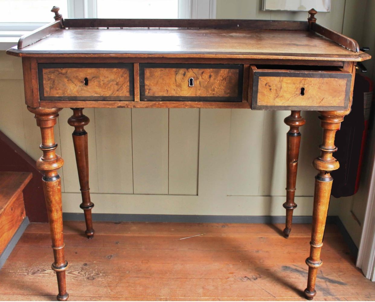 Skrifborð frú Elínborgar. Borðið er 78,5 cm á hæð. Borðplatan er 91 x 49 cm. Fætur eru fjórir og renndir. Tindilfætur. Undir borðplötunni eru þrjár læsanlegar skúffur. Spónlagðar. Renndir súlustubbar eru á hornum að aftan. Hæð þeirra er 7,5 cm. Þeir ganga ofan í göt á borðinu. Inn í þá ganga bríkur, fremur lágar eða 2,7 cm háar. Hliðarfjalir ganga alla leið fram að afsöguðum fremri hornum. Borðið er í brúnum lit (viðarlit) nema efri brún bríka sem hafa verið svartar. Þær eru mikið afmáðar þ.e. svarti liturinn.