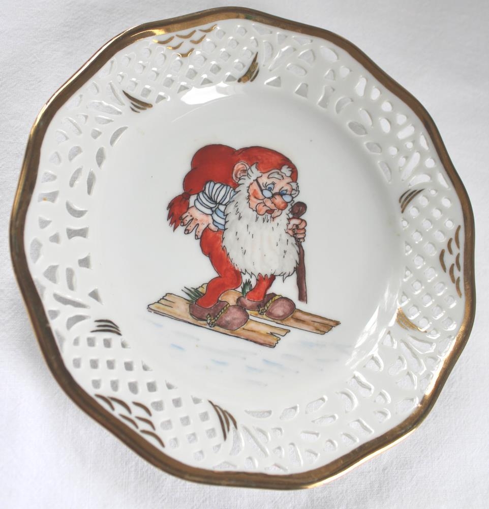 Skrautdiskur, köku- eða sælgætisdiskur, úr hvítu postulíni með gegnmynstruðum börmum. Diskstærð er 17,3 cm. Á brúnum er málað gyllt rönd og í diskbotn er málaður höfuðstór og skeggmikill jólasveinn á fjalarstubbum fyrir skíði með staf í hendi. Á rauðum buxum, með rauða skotthúfu og í röndóttri peysu. Á botninn er skrifað: Guðl. Handm. 1988.
