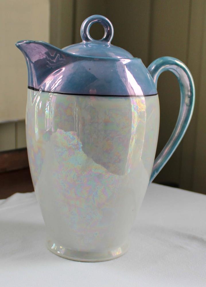 Súkkulaðikanna úr japönsku postulíni, úr sama setti og í sömu litum og nr. 2017-58, 61, 62 og 63. Kannan er 19 cm há, á stútinn, þar sem hún rís hæst. Víðust er hún ofarlega þar sem eyra er fest við efri brún, um 10,5 cm í þvermál. Efsti hluti könnunar niður að eyra (haldi) og eyrað sömuleiðis er blátt að lit. Neðan við er mjó svört rönd. Perlumóðuráferð er á glerjungnum á könnunni utanverðri en hún er hvít að innan. Neðan á könnunni er svartur stimpill með hvolfþaki sem fyrir ofan stendur: CHIKARAMAKI og undir kúplinum stendur MADE IN JAPAN. Stúturinn á könnunni er lokaður fram og á henni er lok með eyra upp úr og loftgati.