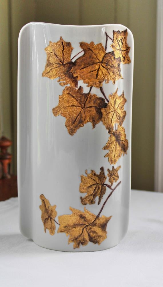 Blómavasi úr hvítu, fremur þykku postulíni. Hæð 24,5 cm. Sporöskjulaga með allhvassar brúnir en breidd er 12,5. Þynnstur er hann um 5 cm breiður og 9,5 cm langur í opið. Neðn á botni er skrifað Gulla '94. Á annari hlið vasans eru gyllt laufblöð máluð á hann, með brúnum æðum og greinum.