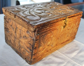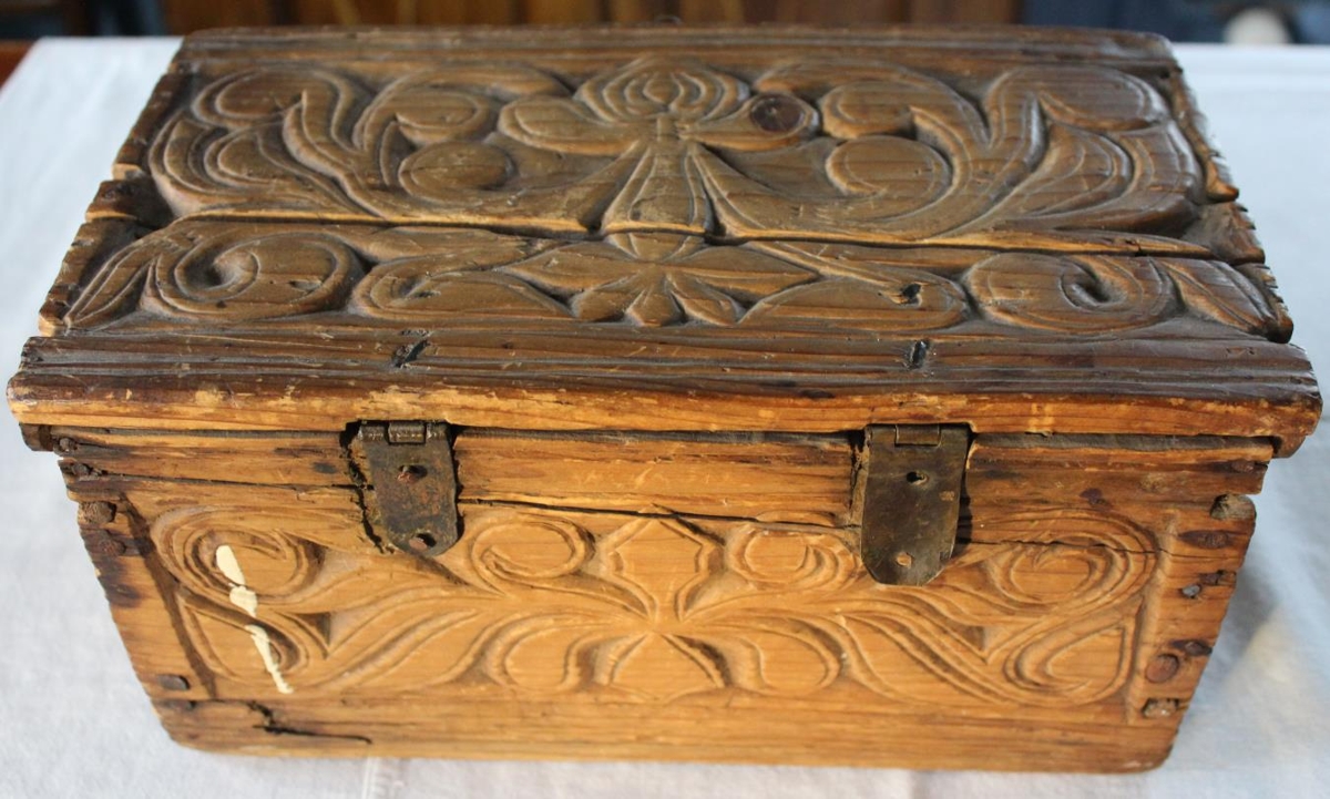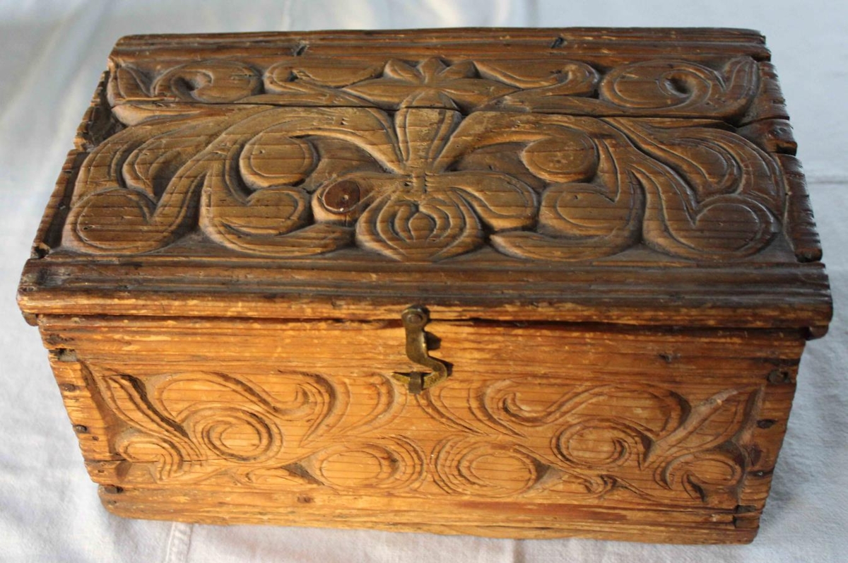 Framhlið, bakhlið, gaflar og lok eru öll útskorin. Klinka er framan á kistlinum, sem gengur í lykkju, til að loka. Hvort tveggja úr koparþynnu.