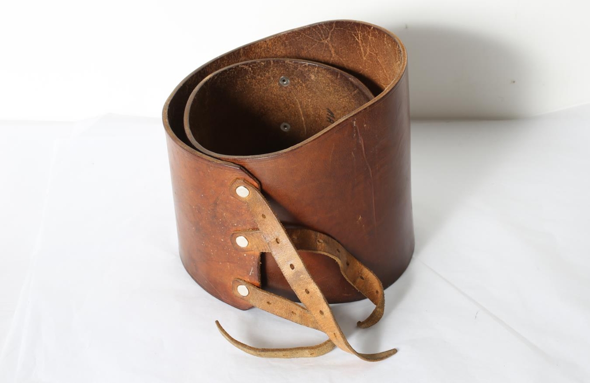 Bakbelti úr þykku brúnu leðri. Er með þremur spennum að framan og var notað til að styrkja bakið. Er merkt Stefáni Jónssyni á Freyshólum og kom úr búinu hans.