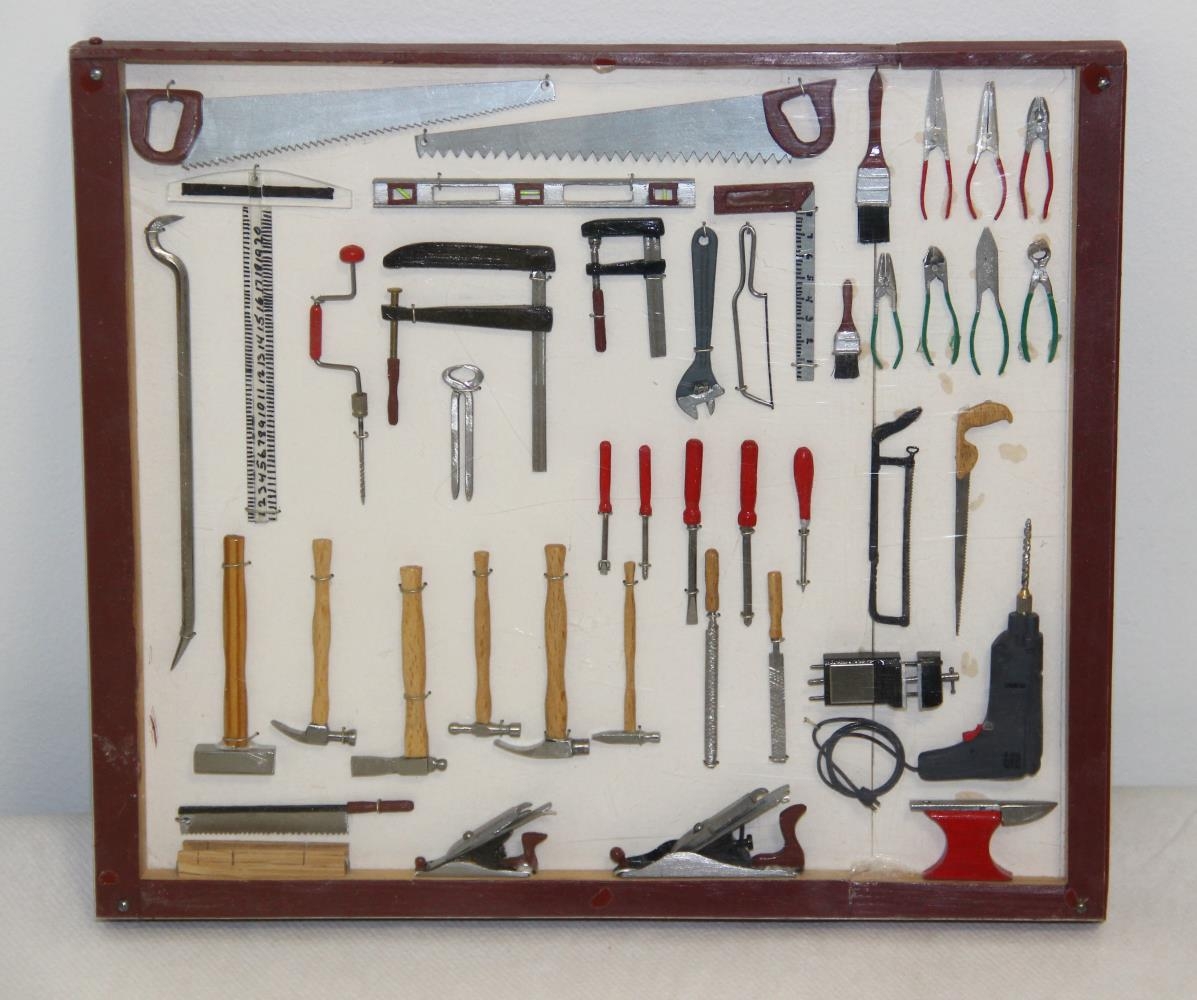 Rammi með litlum verkfærum sem Hjálmar Pétursson úrsmiður smíðaði í höndunum á árunum frá 1989-1993.