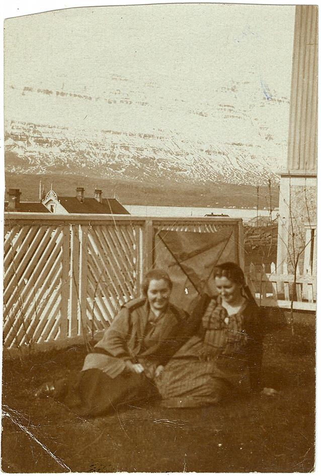 Tvær konur sitja úti í garði. Til vinstri er Lára Bjarnadóttir.