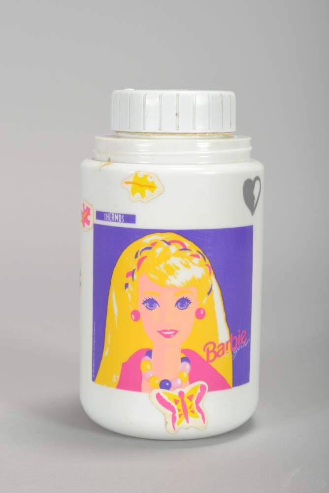 Hvítur Barbie Thermos hitabrúsi með skrúfuð loki. Mynd af Barbie og álímdum smámyndum af laufi, sól og fiðrildi. Texti á mynd er „Barbie for Girls“.