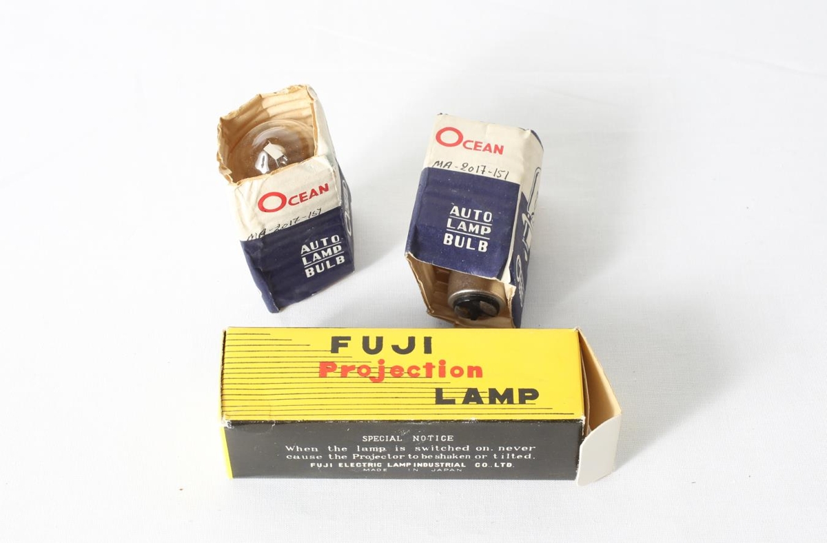 Þrjár ljósaperur sem allar eru stungnar. Tvær eru í bláum og hvítum pakkningum sem á stendur "Ocean Auto lamp Bul B". Ein er í gulum og svörtum kassa sem á stendur "Fuji Projection Lamp. 230 V 300 W." Komu úr búi Stefáns Jónssonar, Freyshólum.