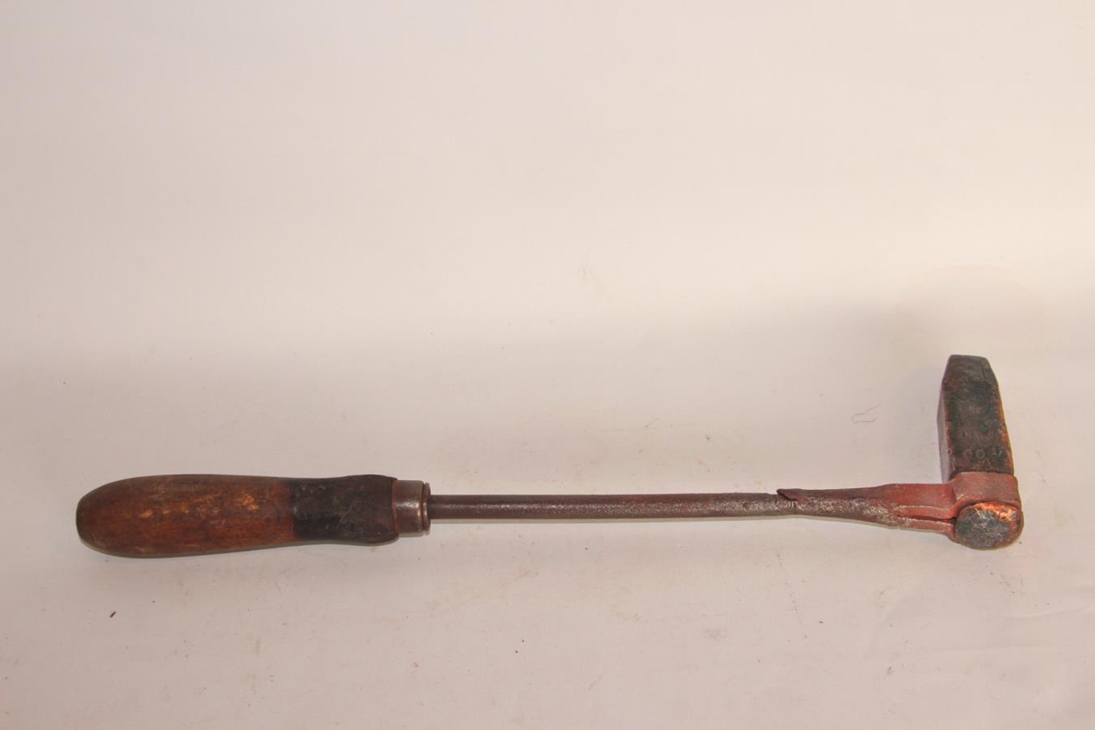 Lóðbolti úr tré, járni og kopar. Lengd 38,5 cm. Stærð lóðboltahauss er 10,4 x 2,4 x 2,5 cm. Skaftið er rennt sívalt. Aðeins brunnið eða sviðið fremst. Í endann er rekið járn. Stöngin hefur brotnað og reynt hefur verið að tjasla henni saman. Járnið er slegið í hring utan um koparinn og járnið merst inn í koparinn. Á koparinn er slegið 500 FALKE.