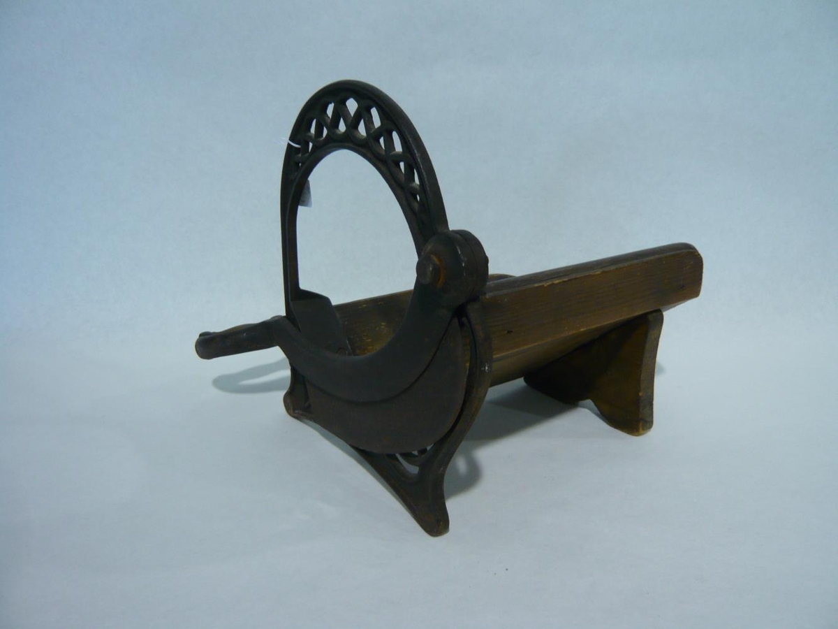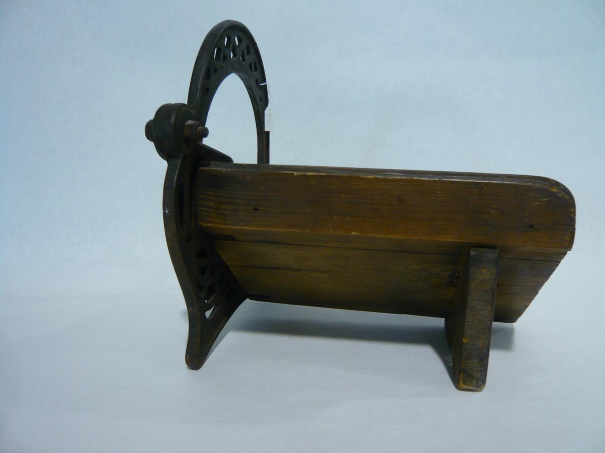 Brauðhnífur á brauðskúffu. Hnífurinn er festur með járnboga sem er skreyttur með gatamunstri. Hnífurinn er nokkuð ryðgaður.