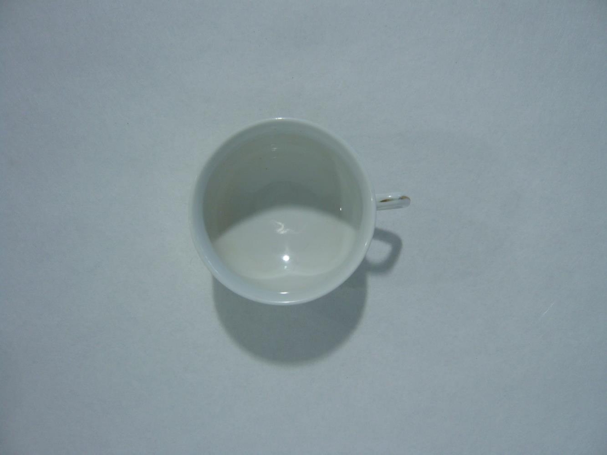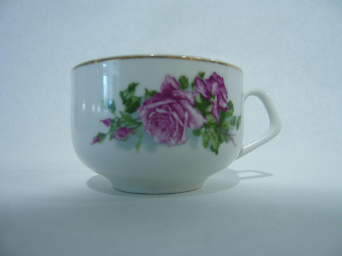 Bolli með bleikri rós og grænum laufblöðum. Gyllt rönd er efst á bollanum. Bolinn er framleiddur í Kína.