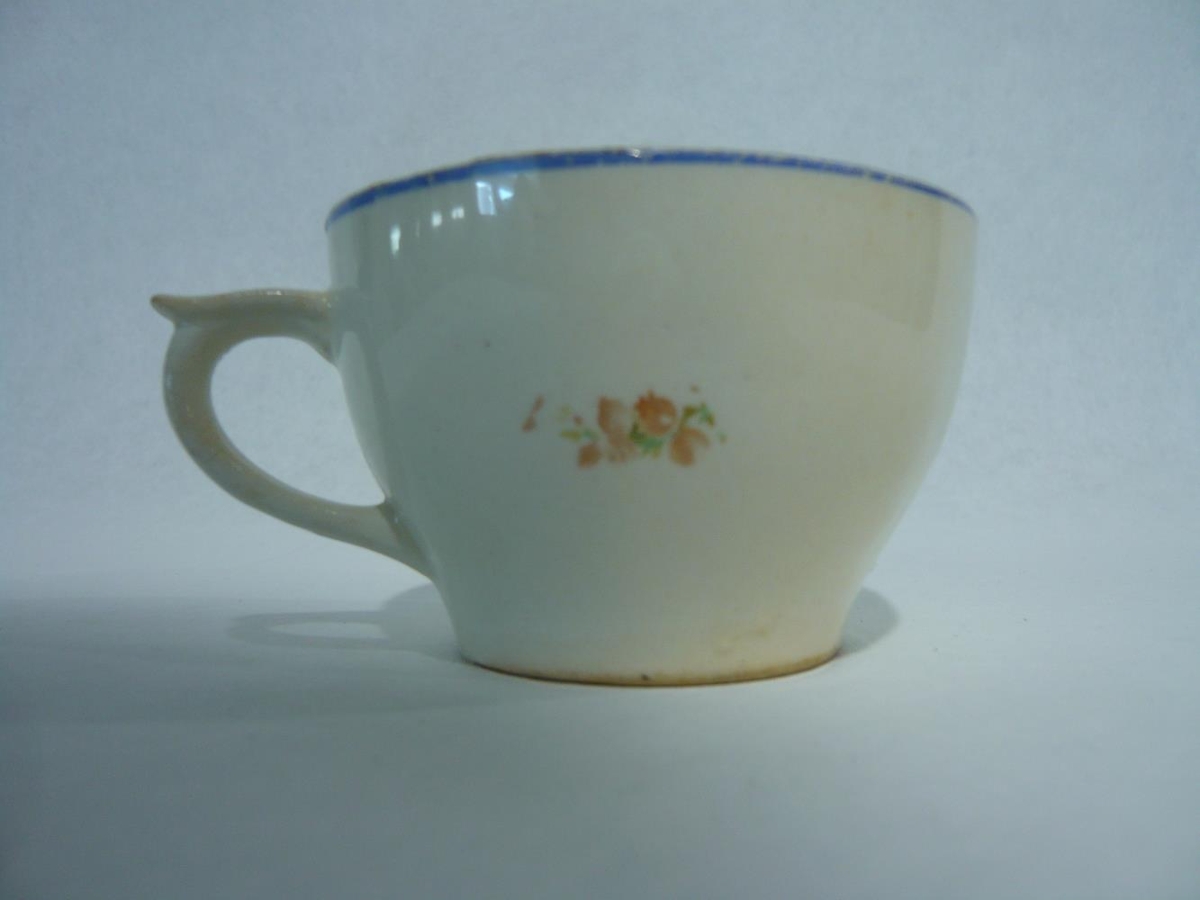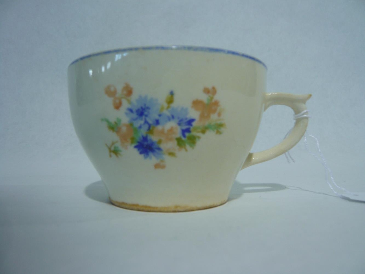 Hvítur bolli með blárri rönd af ofan. Á bollanum er blómamynd. Blómin eru blá, laxableik ber og græn laufblöð. Bollinn er framleiddur af Arabia í Finnlandi.