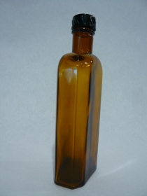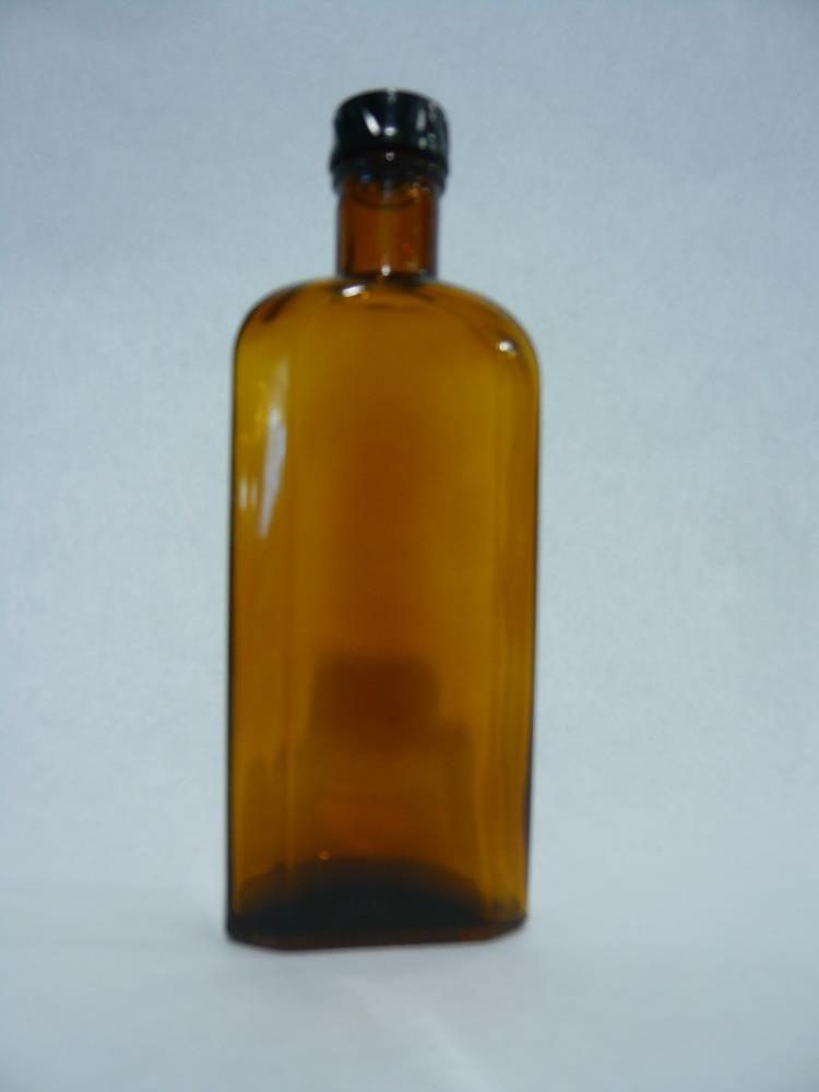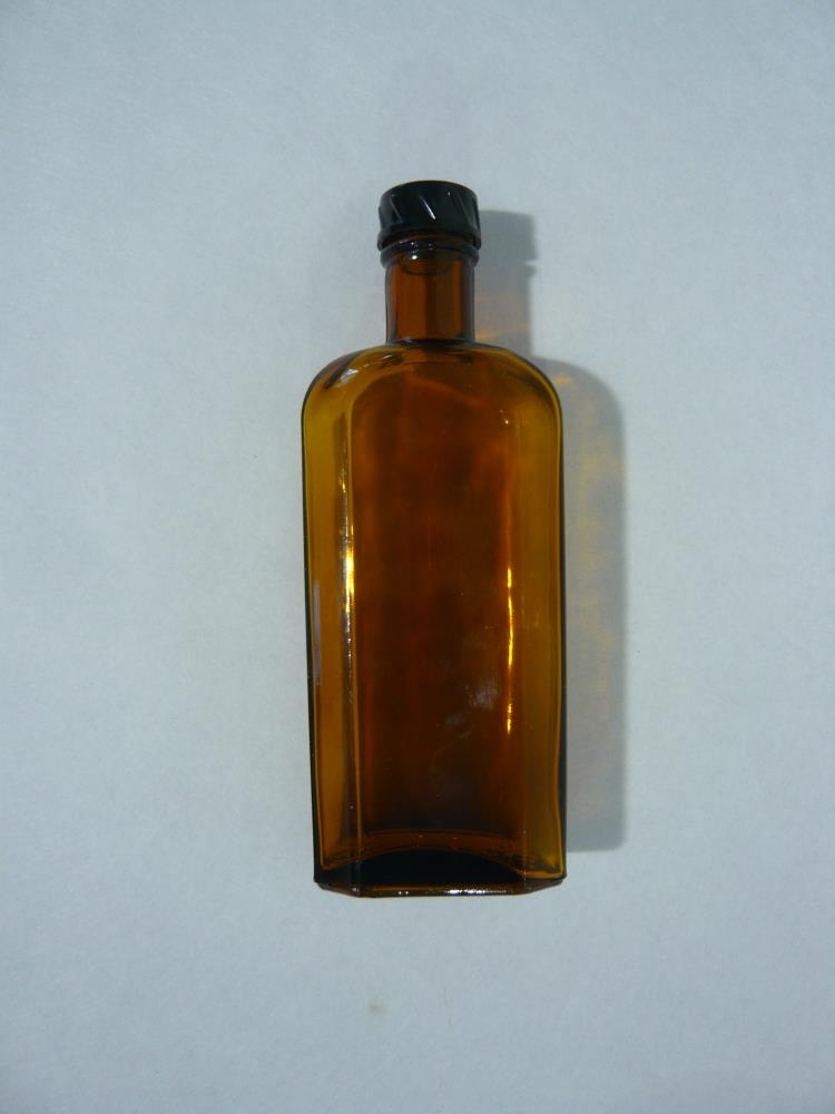 Meðalaflaska úr brúnu gleri með plast tappa.