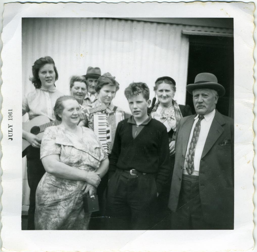 „Myndin er tekin í Seljalandi í Hörðudal,Dalasýslu. Á henni eru Guðlaug Valdís Kristjánsdóttir f.1943, með gítar. Þorbjörg Sigvaldadóttir f.1910, og Kristján Magnússon, f. 1902, hjónin í Seljalandi, næst Kristjáni með harmóniku er önnur dóttir þeirra, Hólmfríður Kristín Kristjánsdóttir. Fyrir framan fjölskylduna er Ólöf Sigvaldadóttir systir Þorbjargar og yngsti sonur hennar Jón Ármann Arason, bjuggu í Borgarnesi. Hjónin lengst t.h. þekki ég ekki. Gætu verið frá Hraunsnefi í Norðurárdal ?“ (HHH 2019)