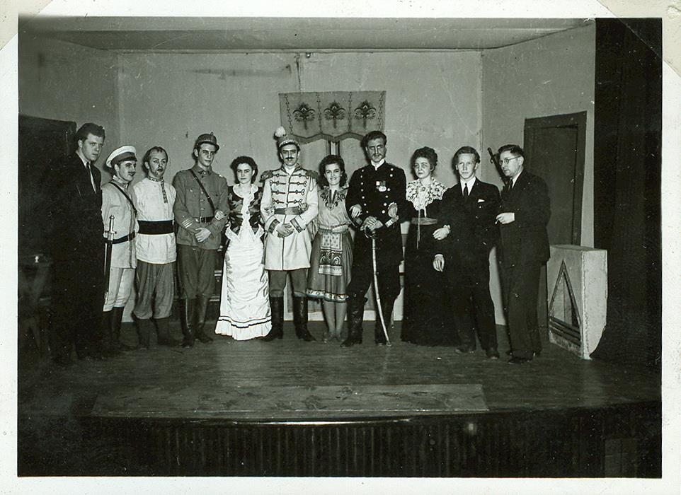 Hópur leikara í búningum. leikendur í kappar og Vopn á Herranótt 1945. Leiðbeinandi Lárus Sigurbjörnsson lengst til hægri.