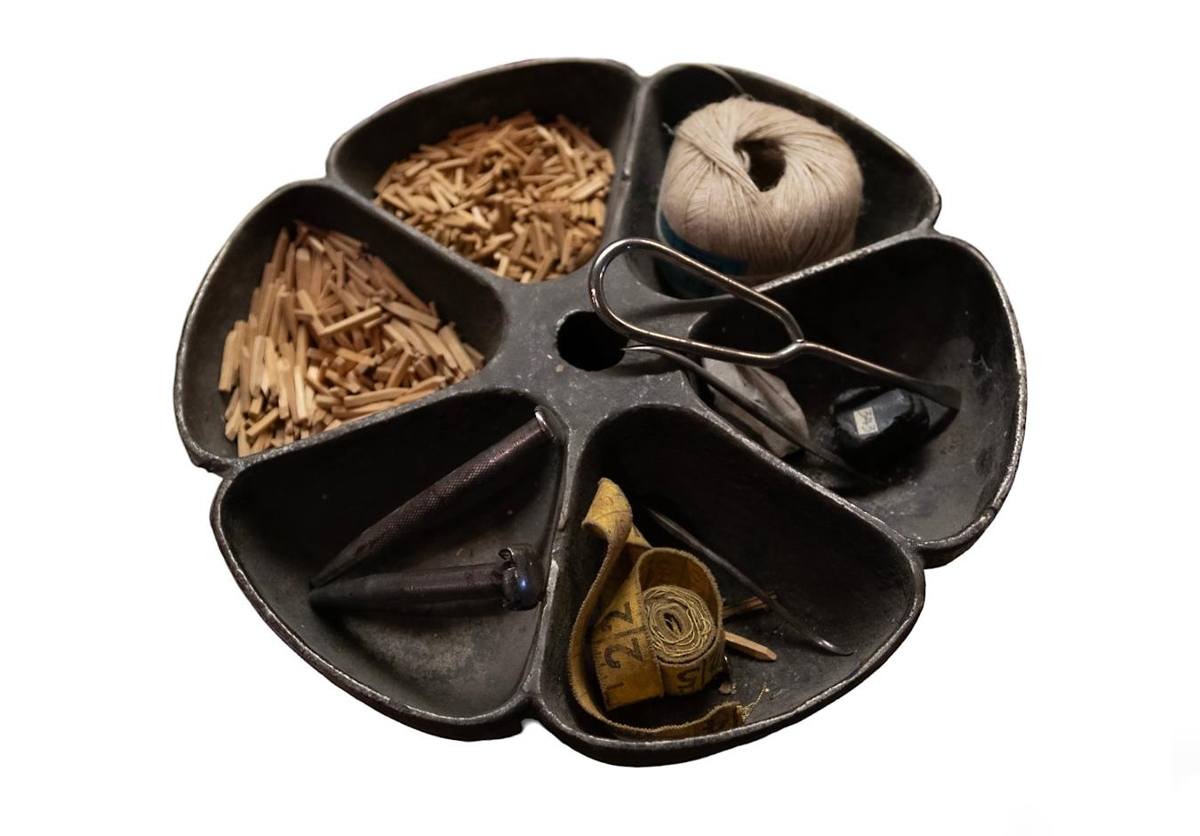 Snúningsbakki með ýmiskonar verkfærum til notkunar í skómsmíði