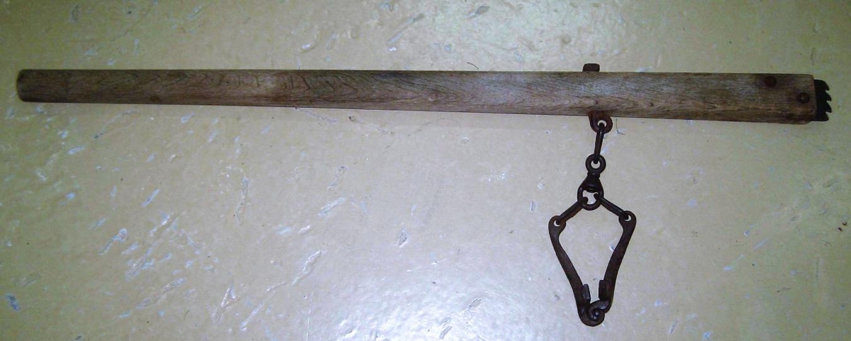 Strekkjarinn hefur 91 cm langt tréskaft og járnkeðju, sem endar í kjafti er grípur um vírinn við strekkingu. Lúinn er hann en heill.