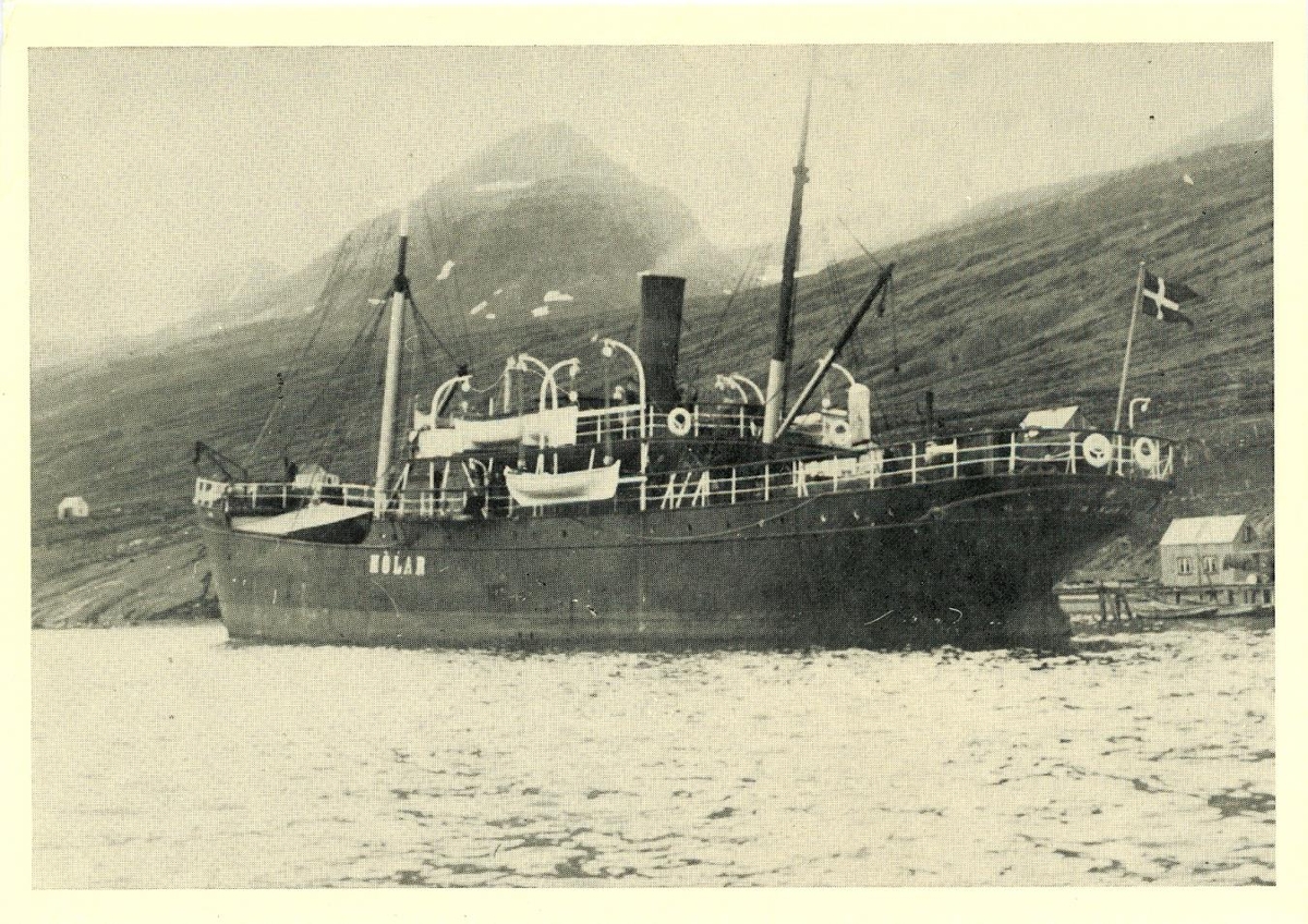 Tvöfalt póstkort með mynd af strandferðaskipi við bryggju á firði. Texti um myndefnið á bakhlið. Útg.: Auðun H. Einarsson.