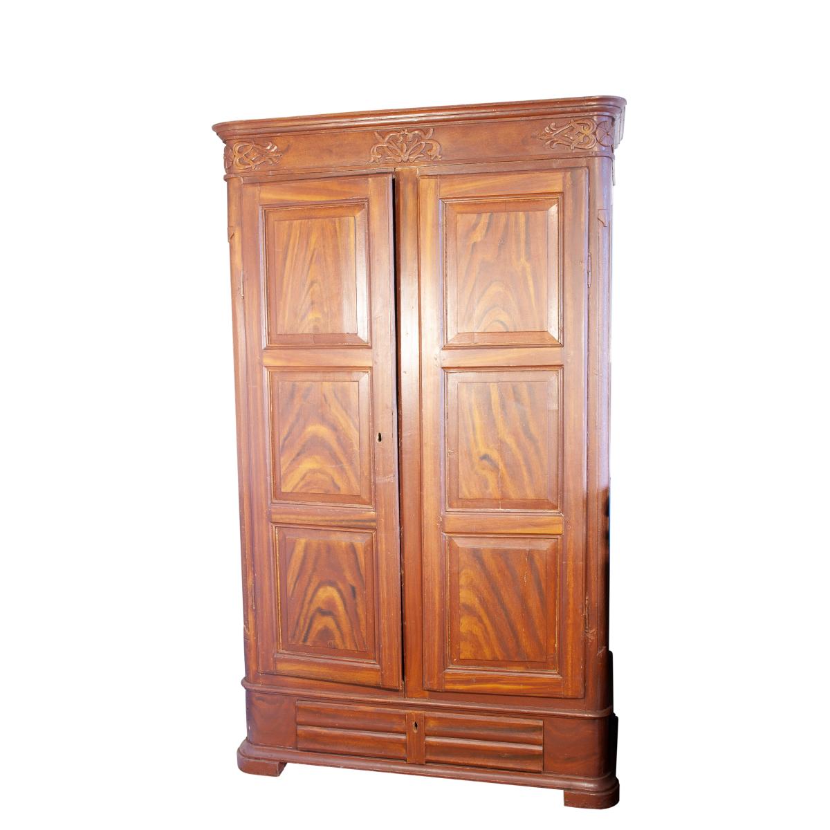 Fataskápur með tveimur spjaldhurðum og skúffu neðst, hægt hefur verið að læsa en lykil vantar.