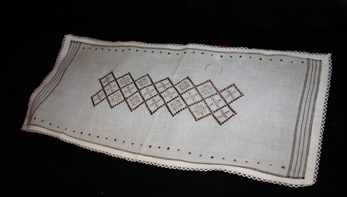 Refill (borðdúkur) ofinn og saumaður af Kristínu Erlendsdóttur. Gef: Guðbjörg Sveinbjarnardóttir, f.25 júlí 1934, Vallarbraut 13 á Akranesi.
