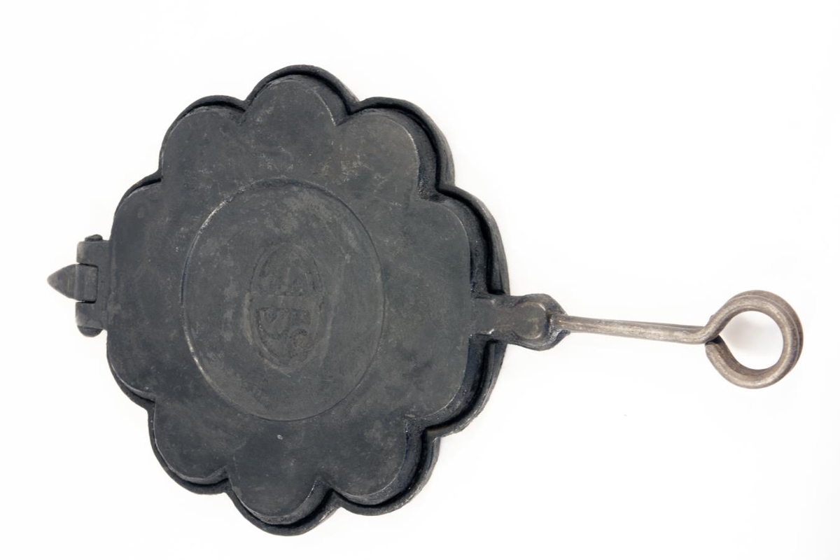 Vöfflujárn ,fyrir kolaeldavél ,með óvenju stuttum sköftum. Gefandi Þórður Jónsson ,Stillholti 15.