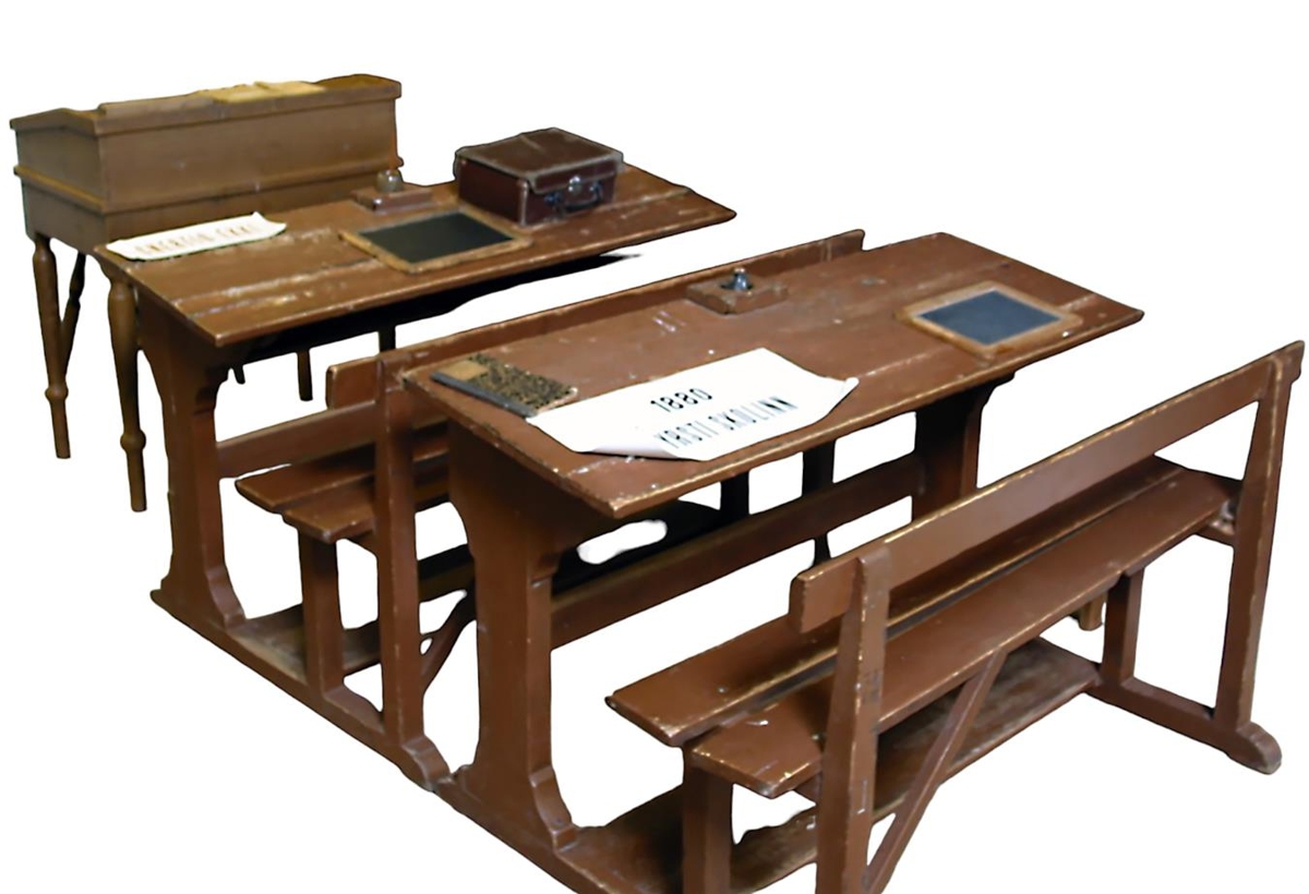 Tvö skólaborð eru úr Barnaskólanum á Akranesi.Fyrsta barnaskóalhús á Akranesi var byggt árið 1878-1879. Það eyðilagðist í eldi haustið 1946.Þegar gamla húsið rúmaði ekki lengur skólabörn þorpsins ,var reistur nýr barnaskóli árið 1912 örskammt frá gamla skólahúsinu. Þessi borð voru smíðuð í nýja skólanum og tekin í notkun um leið og hann (ásamt mörgum fleirum sömu gerðar). Borðin voru notuð meðan barnaskólinn var í þessu húsi til hausts 1950 og lengur. Gagnfræðiskólinn á Akranesi fékk þar inni, eftir að barnaskólinn flutti í nýbyggt skólahús og voru gömlu borðin þá enn á sínum stað og notuð nær öll starfsár gagnfræðiskólans þarna ,til 1959.Með endurnýjun skólaborðana vr barnaskólinn í Innri-Akraneshreppi að Heynesi látinn njóta nokkurra hinna gömlu borða ,m.a. þeirra þriggja sem hér eru og voru þau notuð þar til hausts 1962 en lögð til hliðar og önnur ný komu í þeirra stað .Lætur því nærri að börn á Akranesi hafi setið við þessi borð í 50 vetur. Borðin voru afhent byggðasafninu í des.1962. Gerði það oddviti Innri-Akraneshrepps,Guðmundur Jónsson ,bóndi á Innri-Hólmi og ók hann þeim sjálfur hingað heim að Görðum.Hann ,sem og hundrað annarra ,á bernsku minningar tengdar þessum skólaborðum.