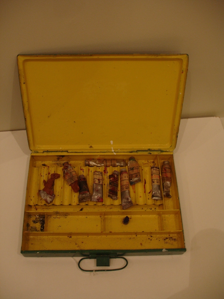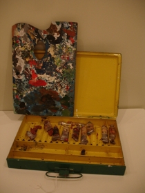 Kassinn er úr málmi og l´til spenna er framna á honum til að krækja aftur lokinu. Viðarbretti (fyrir málningu) er rennt í rauf í kassanum yfir hólfunum fyrir túbur og pensla. Nokkrar túbur eru í kassanum, mismikið hefur verið notað úr þeim.