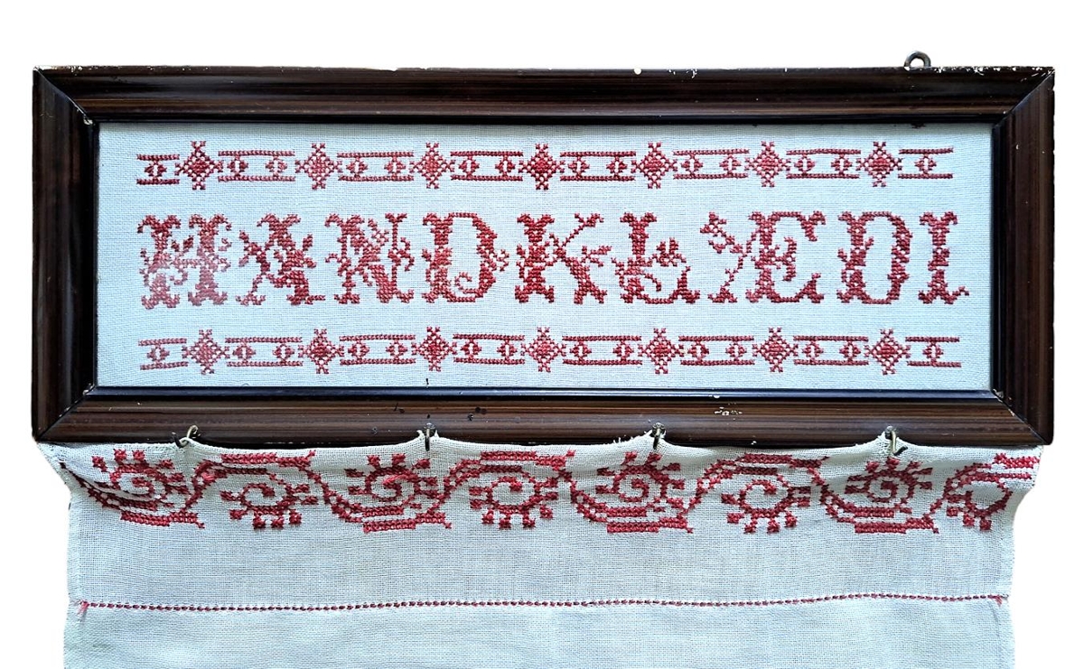 Handklæðahengi ,sem notað var hjá servanti í gestaherbergi á Sólmundarhöfða. Orðið HANDKLÆÐI er saumað í hvítt efni með rauðu garni og síðan innrammað í brúnan tréramma, sem hengdur var á vegg.
