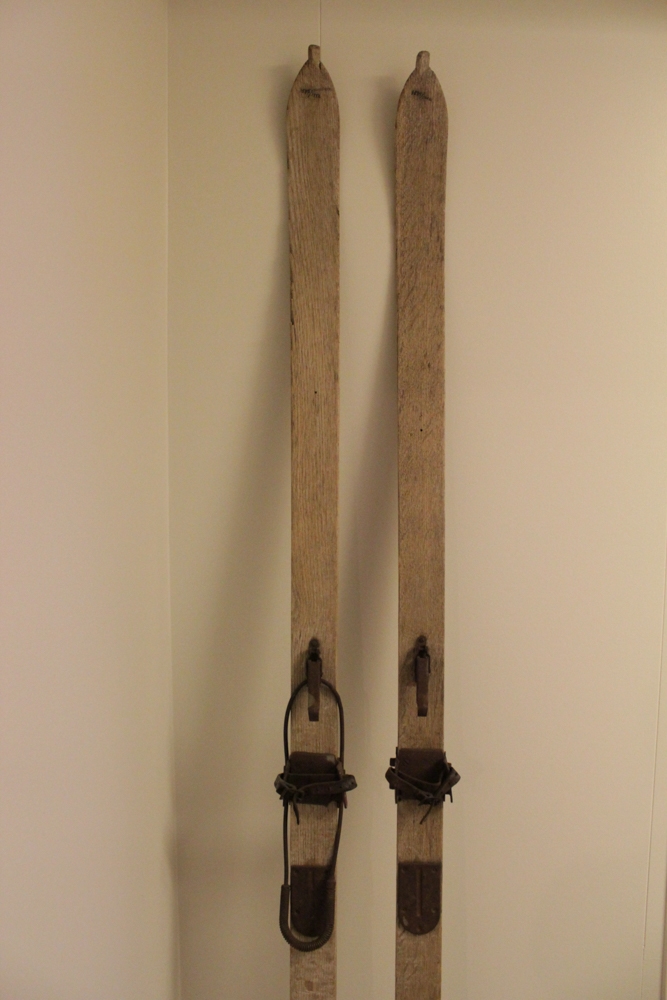 Skíðin voru fyrst með tábindingum. Nú við skráningu eru skíðin með járnbindingum aftur fyrir hæl og járn- og leðurbindingu yfir rist. Á annað skíðið vantar hluta úr bindingunni. Þau voru notuð til um 1970. Annað skíðið er 218 cm á lengd en hitt 217 cm.
