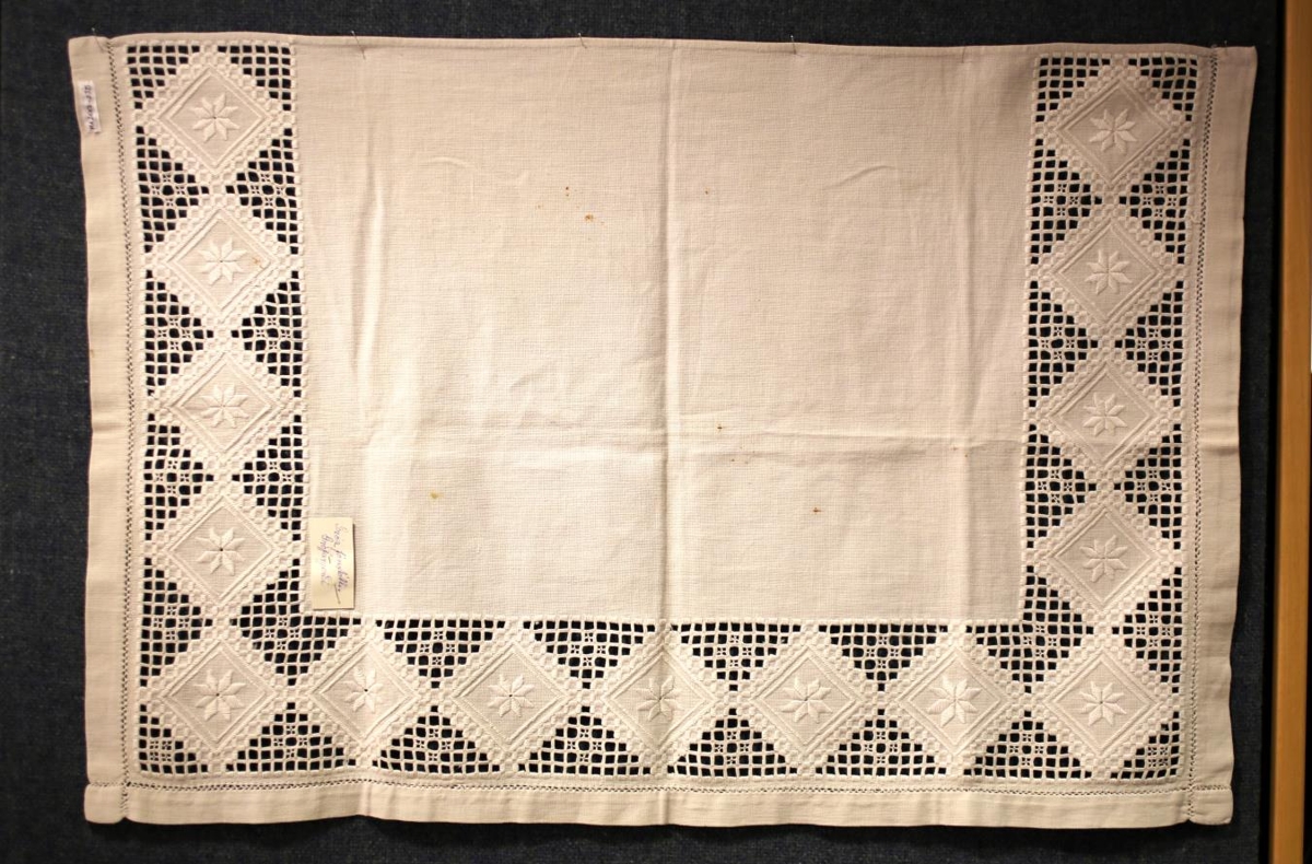 Hvítur harðangurssaumaður kommóðudúkur sem saumaður er á þrjá vegu af Gróu Jónsdóttur. Starfskonur Félagsstarfs aldraðra björguðu dúknum úr dánarbúi Alfreðs Eymundssonar þegar hann lést.