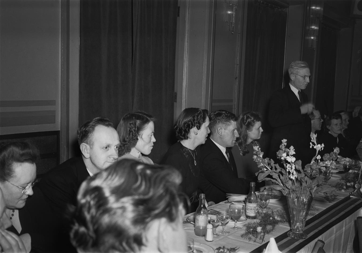 Hótel Borg; Hóf fyrir Brynjólf Bjarnason. Fólk situr við borð. Maður stendur og heldur ræðu