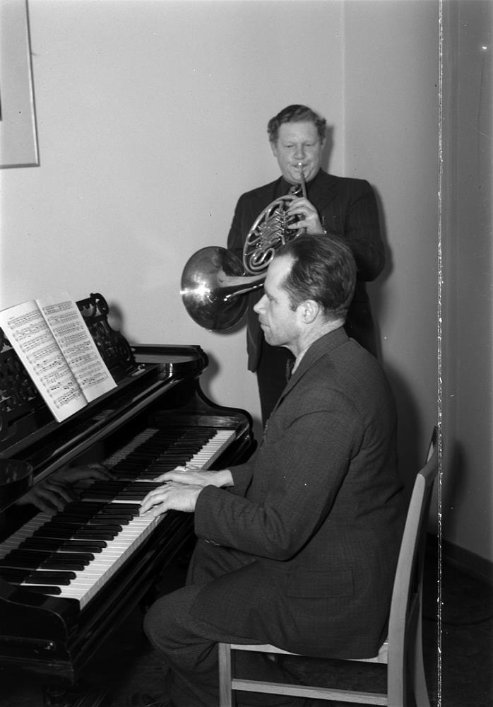 Tveir menn spila á hljóðfæri. Annar stendur við flygilinn og spilar á franskt horn og Viktor Urbancic spilar á flygilinn. Hljómlistarmenn fyrir Þjóðviljahátíðina.