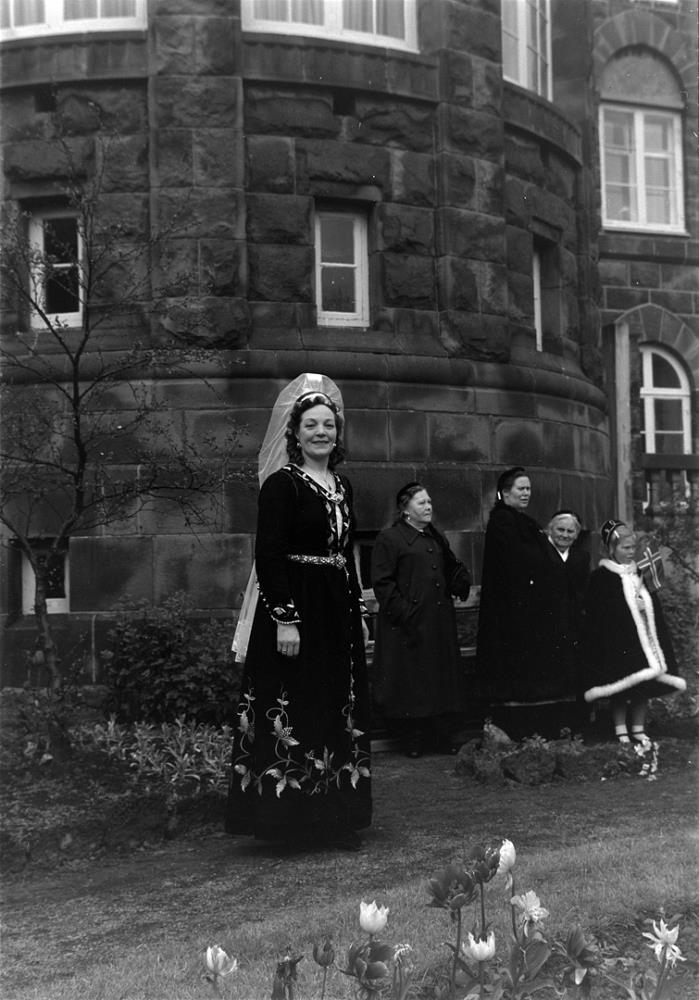 Fjallkonan Anna Guðmundsdóttir leikkona í Alþingisgarðinum. Nokkrar konur í bakgrunni. Hátíðarhöld þann 17. júní 1956