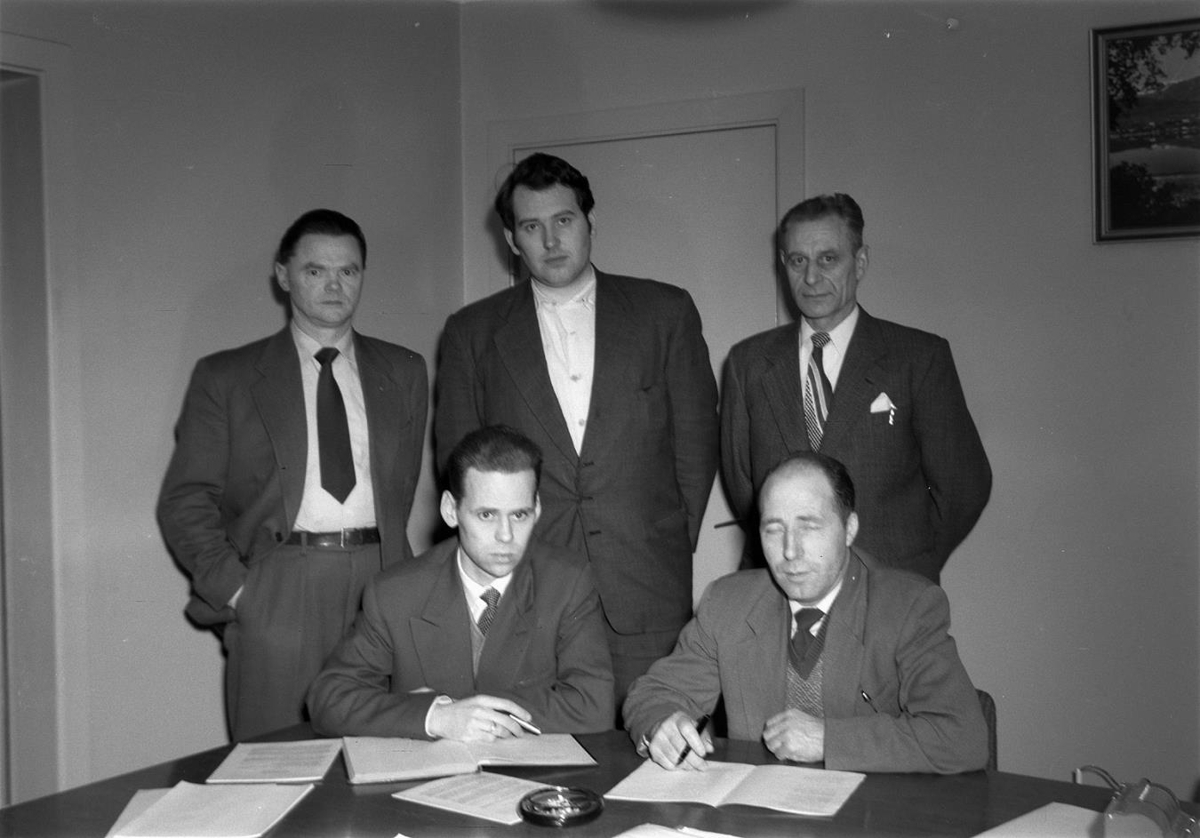 Fundur Dagsbrúnar. Fimm menn stilla sér upp fyrir myndatöku. Efri röð í miðið: Guðmundur J. Guðmundsson. Fremri röð til hægri: Eðvarð Sigurðsson