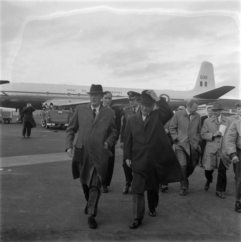 Hópur manna gengur frá flugvélinni á Keflavíkurflugvelli. MacMillan á Keflavíkurflugvelli