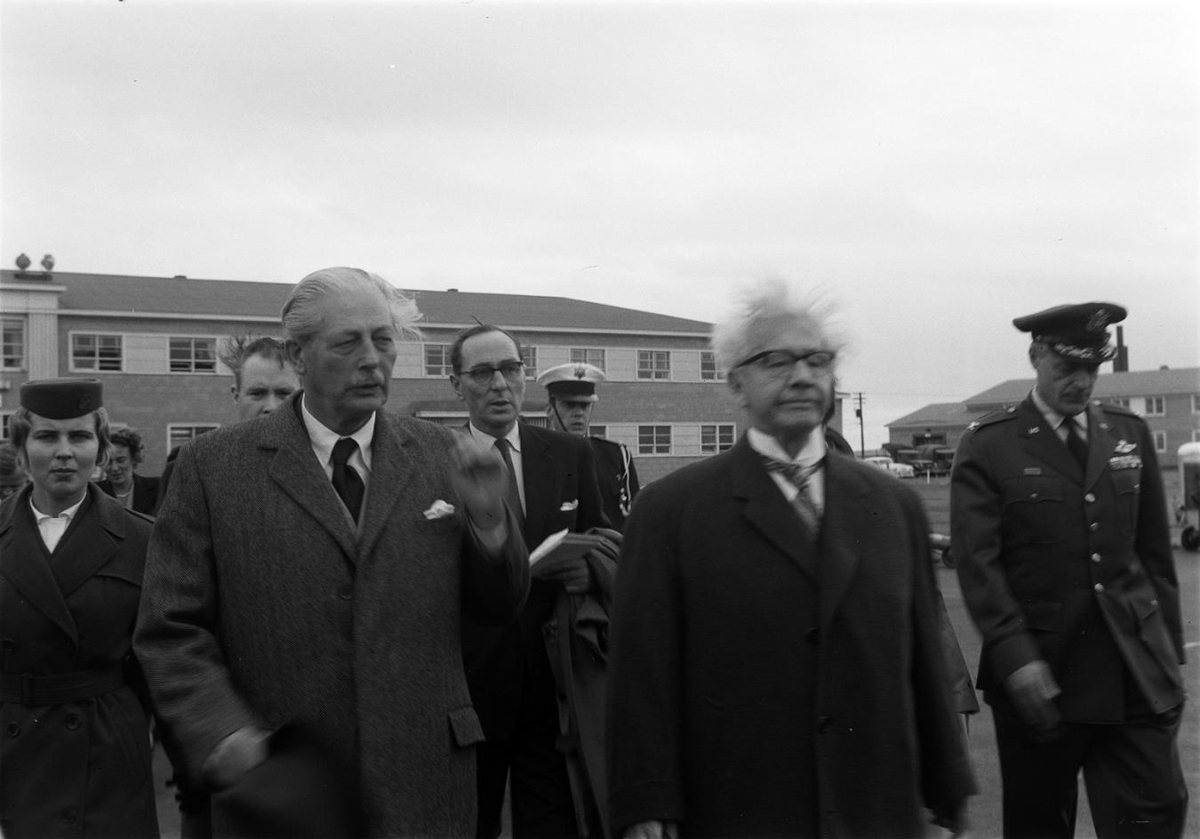 Harold Macmillan og Ólafur Thors á Keflavíkurflugvelli. Hópur manna og gamla flugstöðin á Keflavíkurflugvelli í bakgrunni. MacMillan á Keflavíkurflugvelli